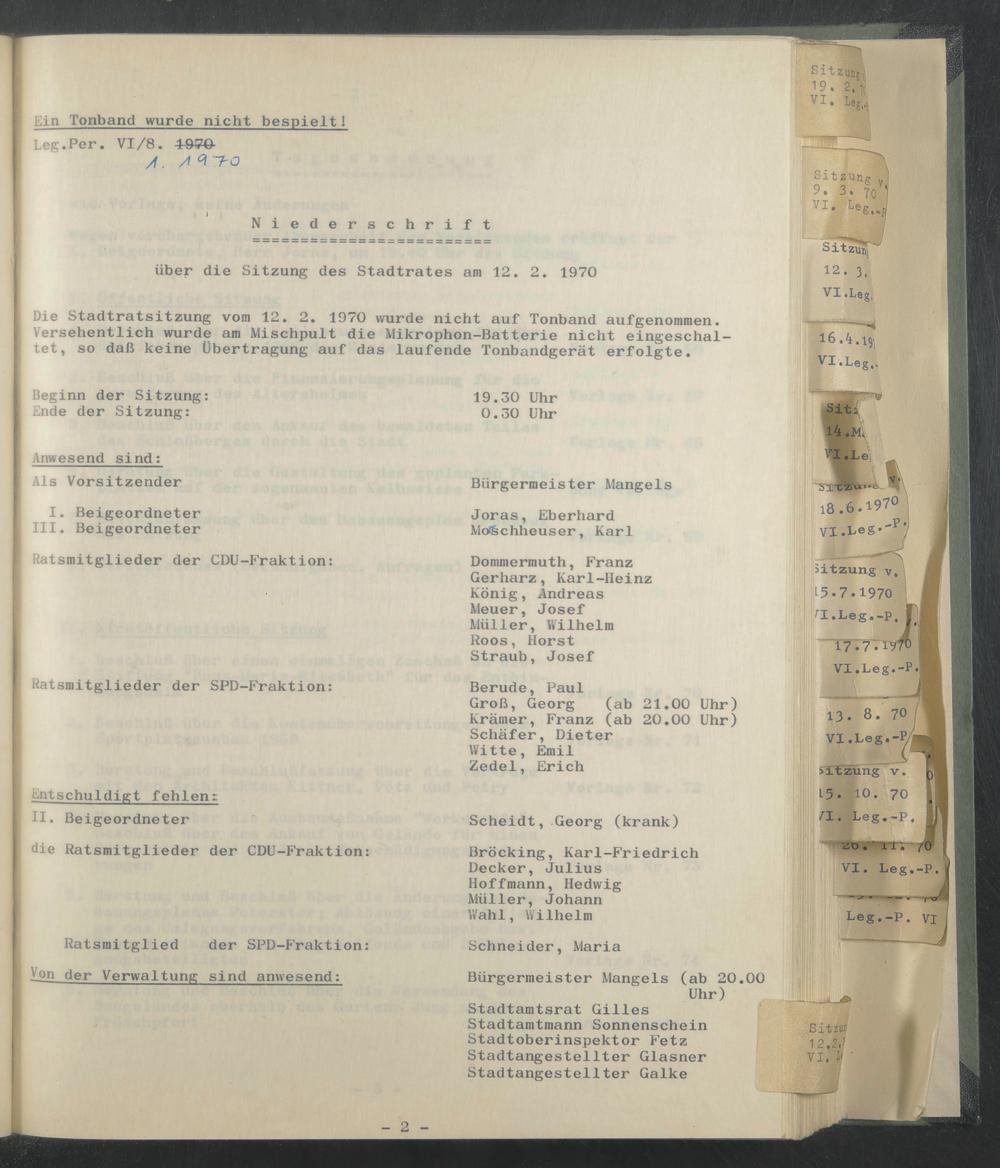 Die Stadtratsitzung vom 12. 2. 1970 wurde nicht auf Tonband aufgenommen. Versehentlich wurde am Mischpult die Mikrophon-Batterie nicht eingeschal- tet, so daß keine Übertragung auf das laufende Tonbandgerät erfolgte.