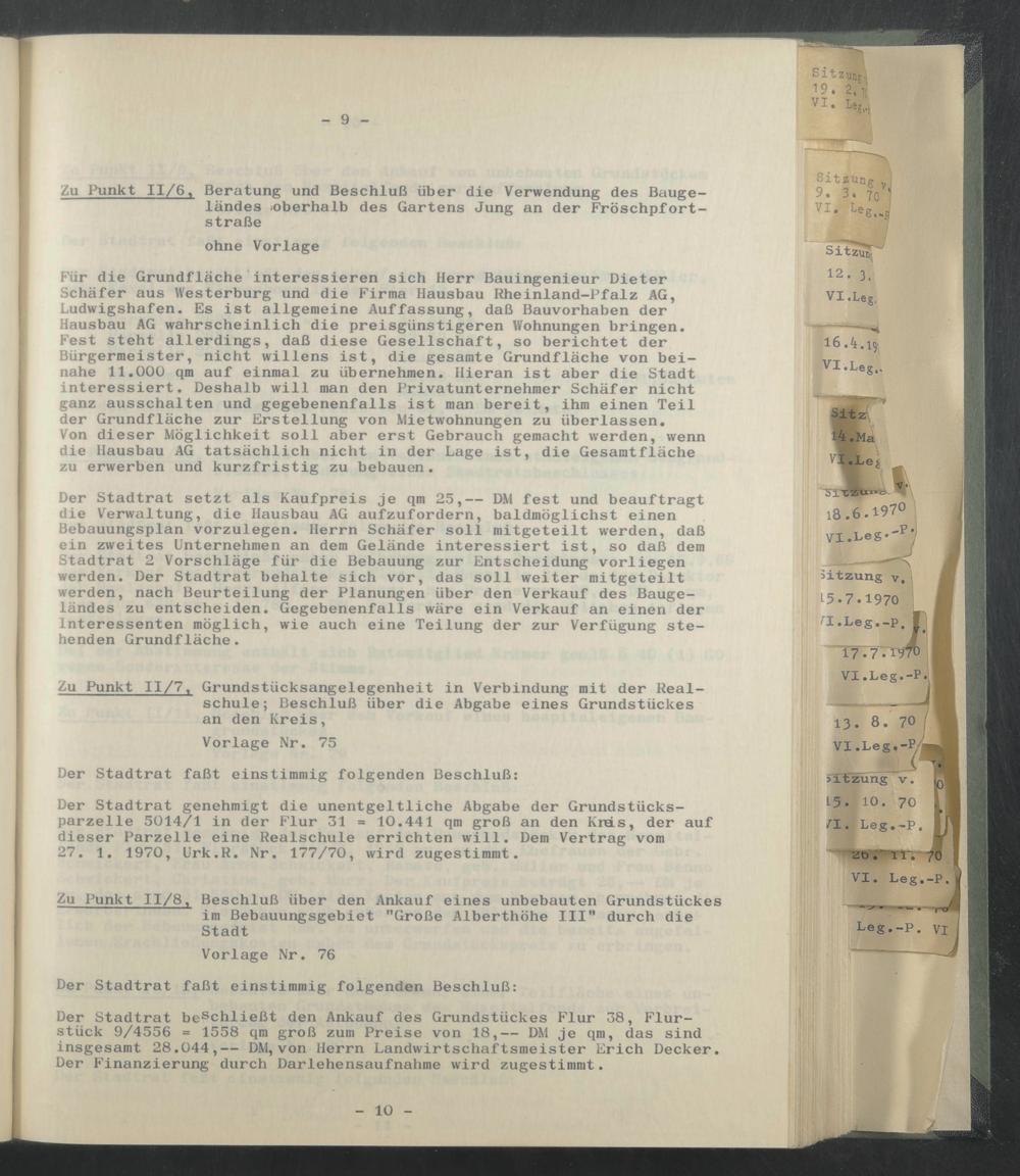 Der Stadtrat setzt als Kaufpreis je qm 25,— DM fest und beauftragt die Verwaltung, die Hausbau AG aufzufordern, baldmöglichst einen Bebauungsplan vorzulegen. Herrn Schäfer soll mitgeteilt werden, daß ein zweites Unternehmen an dem Gelände interessiert ist, so daß dem Stadtrat 2 Vorschläge für die Bebauung zur Entscheidung vorliegen werden. Der Stadtrat behalte sich vor, das soll weiter mitgeteilt werden, nach Beurteilung der Planungen über den Verkauf des Baugeländes zu entscheiden. Gegebenenfalls wäre ein Verkauf an einen der Interessenten möglich, wie auch eine Teilung der zur Verfügung stehenden Grundfläche.