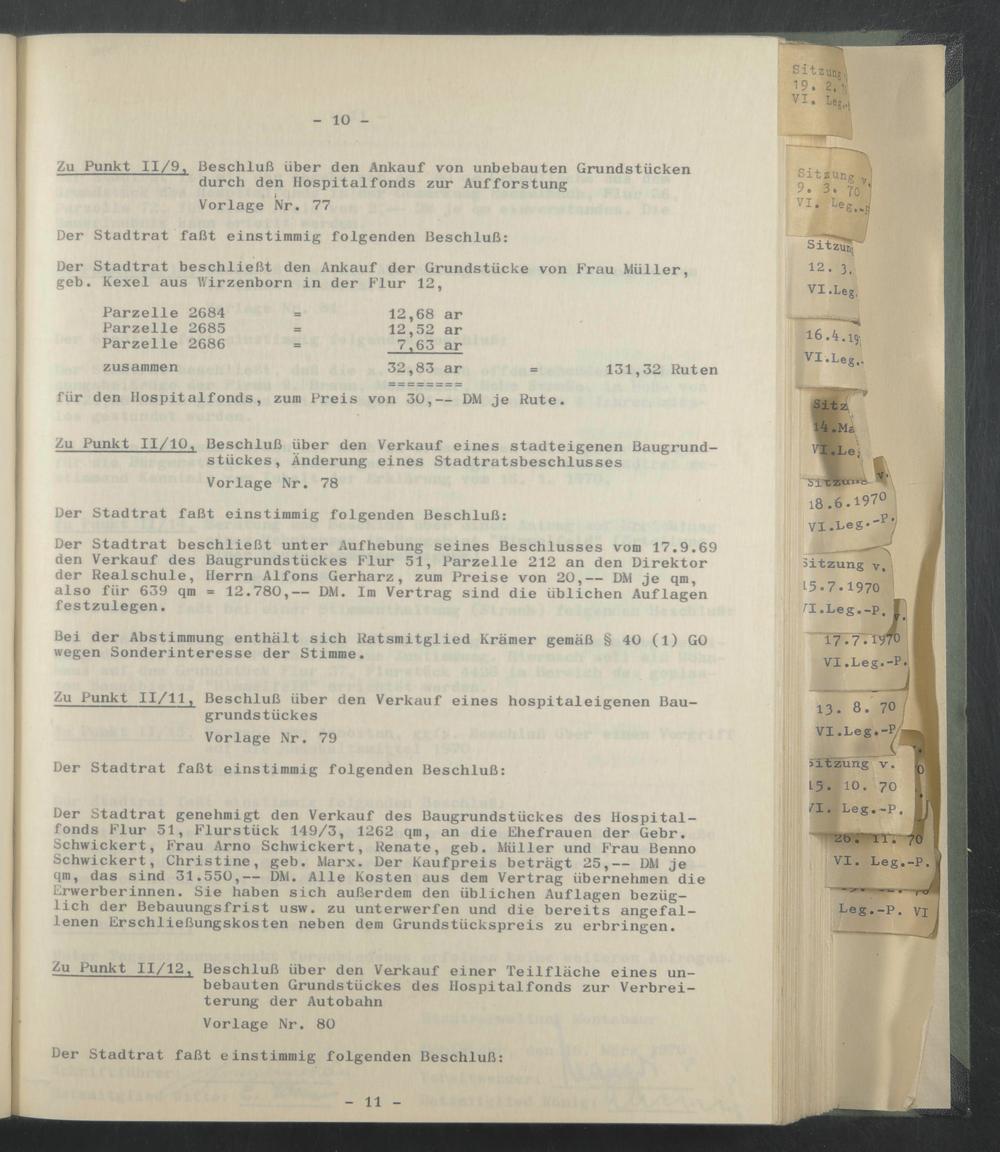 Der Stadtrat genehmigt den Verkauf des Baugrundstückes des Hospitalfonds Flur 51, Flurstück 149/3, 1262 qm, an die Ehefrauen der Gebr. Schwickert, Frau Arno Schwickert, Renate, geb. Müller und Frau Benno Schwickert, Christine, geb. Marx. Der Kaufpreis beträgt 25,— DM je qm, das sind 31.550,— DM. Alle Kosten aus dem Vertrag übernehmen die Erwerberinnen. Sie haben sich außerdem den üblichen Auflagen bezüglich der Bebauungsfrist usw. zu unterwerfen und die bereits angefallenen Erschließungskosten neben dem Grundstückspreis zu erbringen.