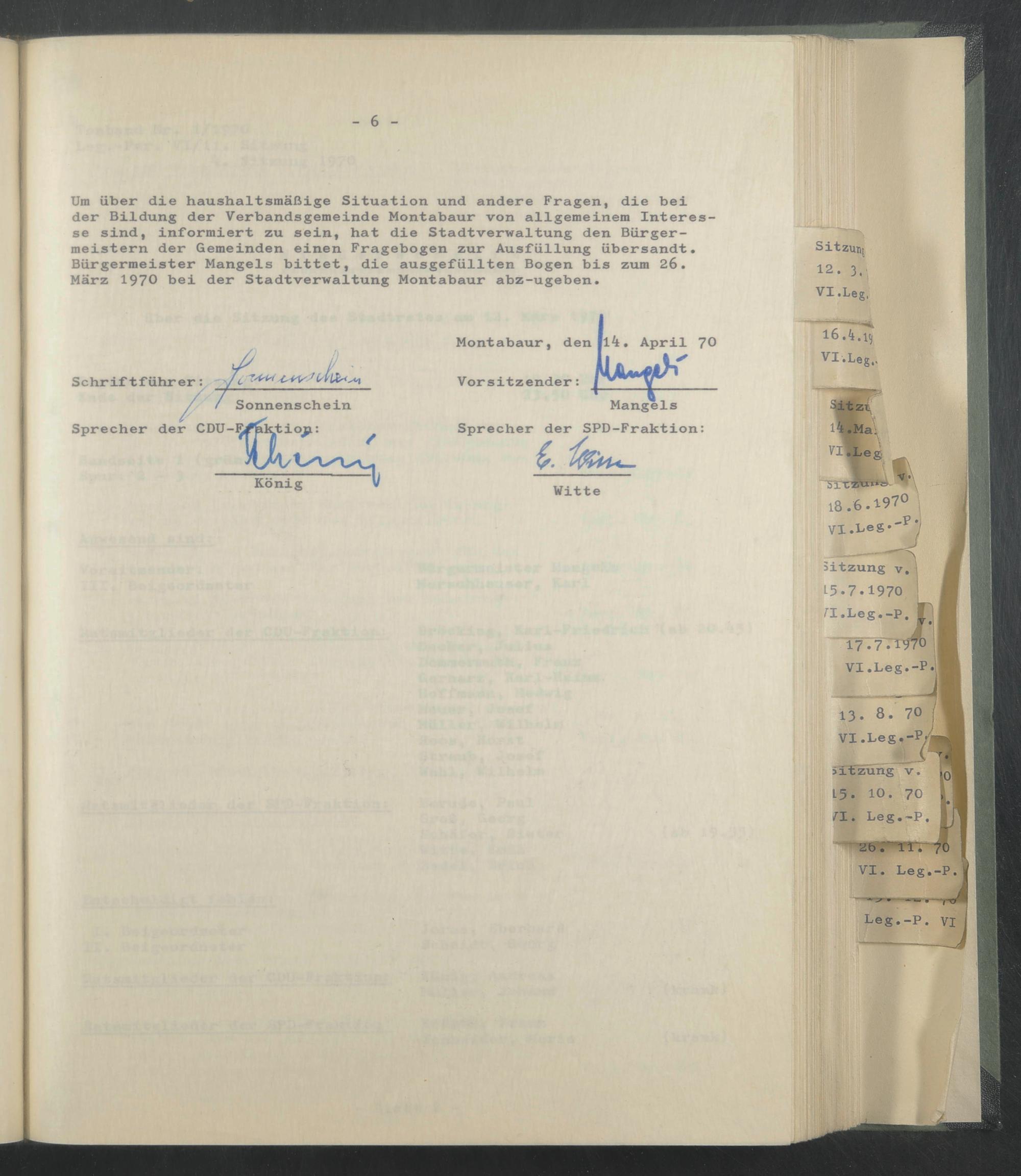 Um über die haushaltsmäßige Situation und andere Fragen, die bei der Bildung der Verbandsgemeinde Montabaur von allgemeinem Interesse sind, informiert zu sein, hat die Stadtverwaltung den Bürgermeistern der Gemeinden einen Fragebogen zur Ausfüllung übersandt. Bürgermeister Mangels bittet, die ausgefüllten Bogen bis zum 26. März 1970 bei der Stadtverwaltung Montabaur abz-ugeben.