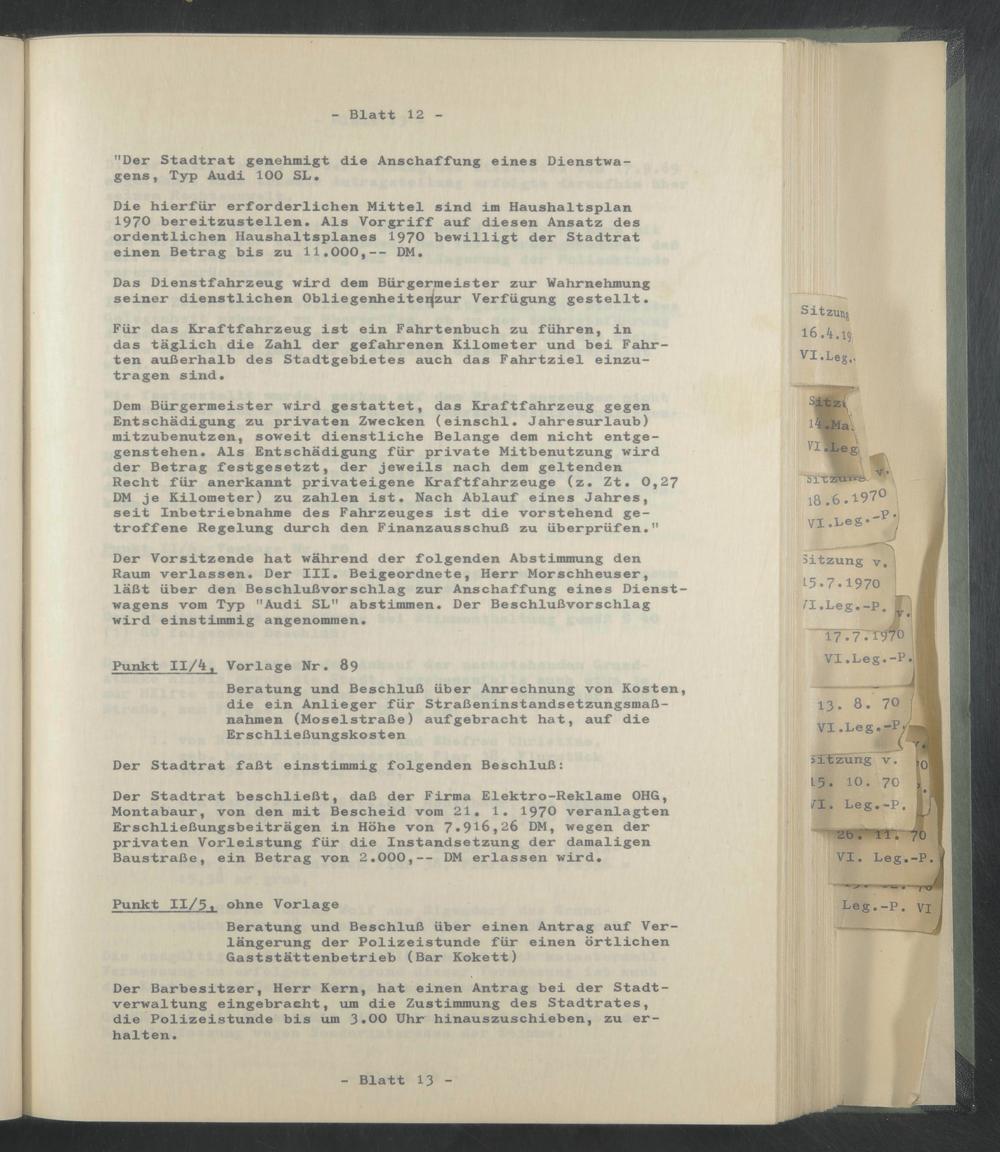 "Der Stadtrat genehmigt die Anschaffung eines Dienstwagens, Typ Audi 100 SL.