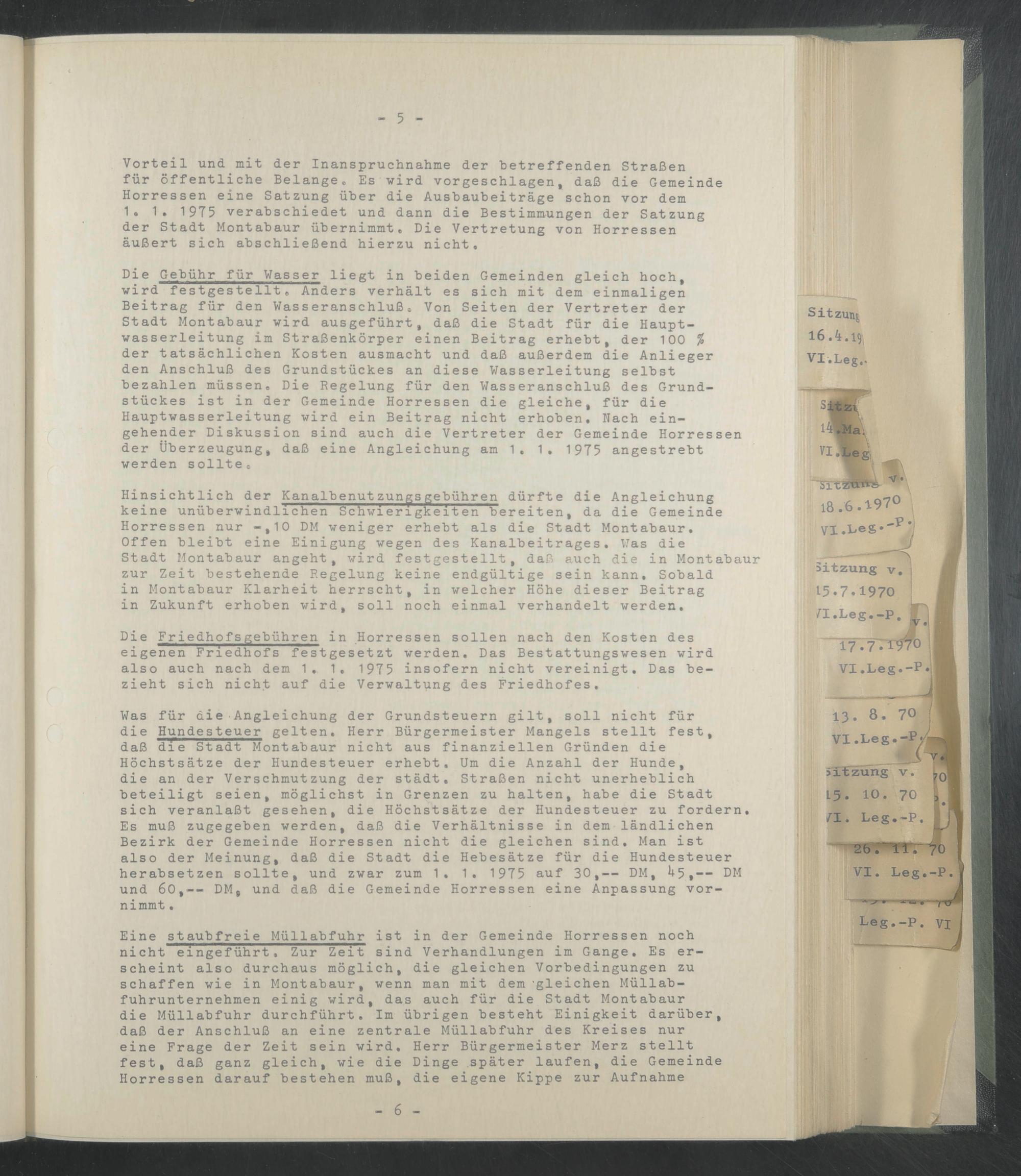 Vorteil und mit der Inanspruchnahme der betreffenden Straßen für öffentliche Belange. Es wird vorgeschlagen, daß die Gemeinde Horressen eine Satzung über die Ausbaubeiträge schon vor dem 1. 1. 1975 verabschiedet und dann die Bestimmungen der Satzung der Stadt Montabaur übernimmt. Die Vertretung von Horressen äußert sich abschließend hierzu nicht.