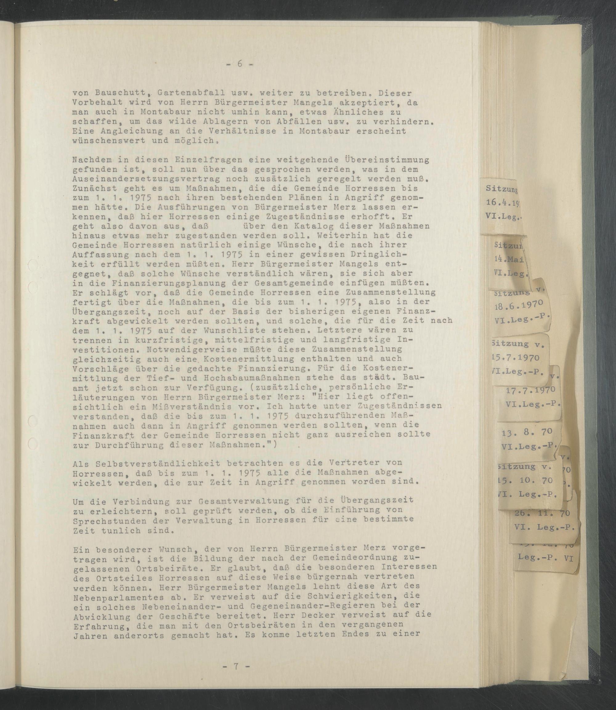 Nachdem in diesen Einzelfragen eine weitgehende Übereinstimmung gefunden ist, soll nun über das gesprochen werden, was in dem Auseinandersetzungsvertrag noch zusätzlich geregelt werden muß. Zunächst geht es um Maßnahmen, die die Gemeinde Horressen bis zum 1. 1. 1975 nach ihren bestehenden Plänen in Angriff genommen hätte. Die Ausführungen von Bürgermeister Merz lassen erkennen, daß hier Horressen einige Zugeständnisse erhofft. Er geht also davon aus, daß über den Katalog dieser Maßnahmen
