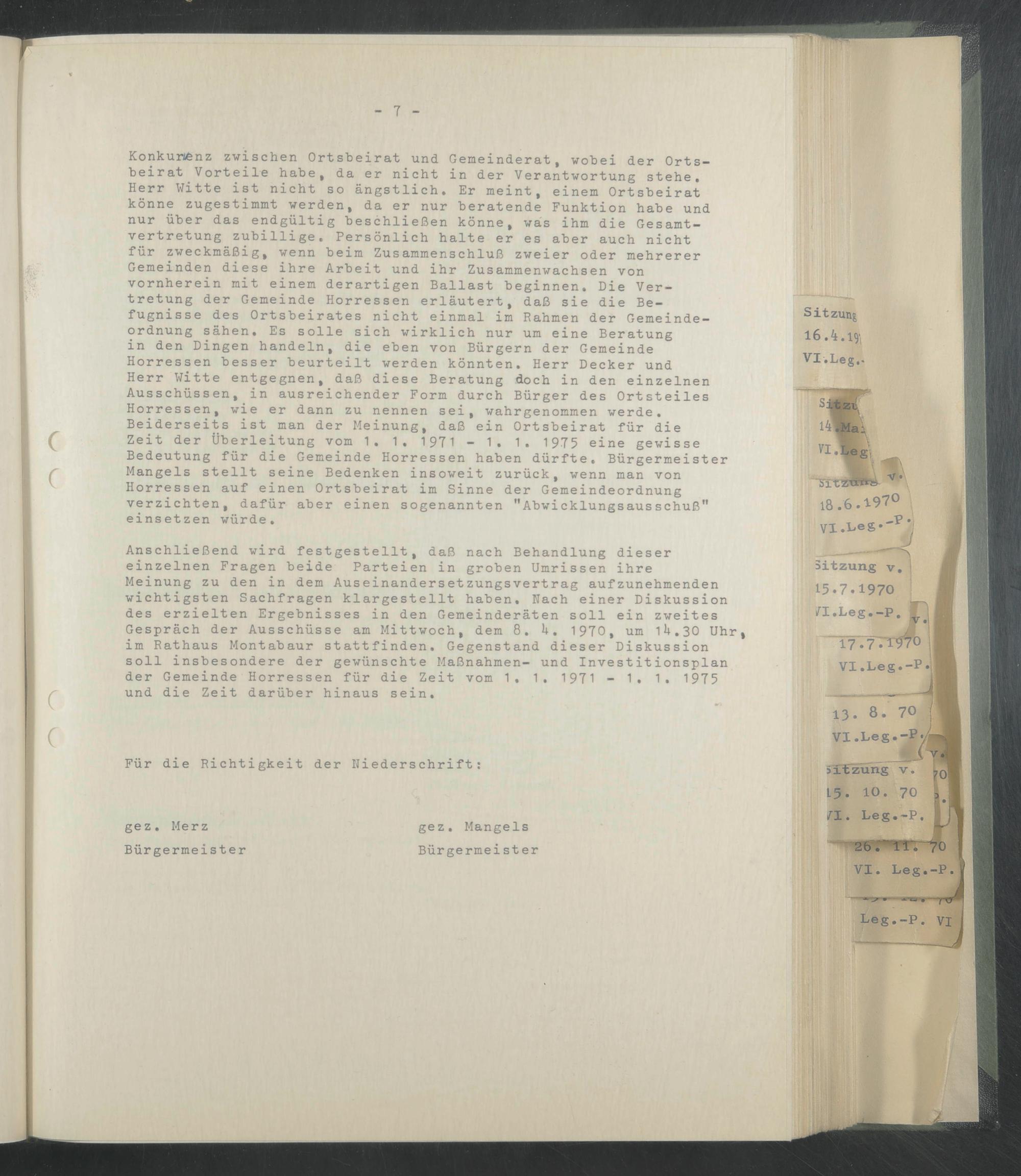 gestellt, daß nach Behandlung dieser Parteien in groben Umrissen ihre Auseinandersetzungsvertrag aufzunehmenden klargestellt haben. Nach einer Diskussion ses in den Gemeinderäten soll ein zweites e am Mittwoch, dem 8. 4. 1970, um 14.30 Uhr, tattfinden. Gegenstand dieser Diskussion gewünschte Maßnahmen- und Investitionsplan für die Zeit vom 1. 1. 1971 - 1. 1. 1975 inaus sein.