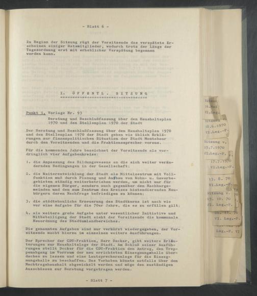 Der Beratung und Beschlußfassung über den Haushaltsplan 1970 und den Stellenplan 1970 der Stadt gehen wie üblich Erklärungen zur finanzpolitischen Situation der Stadt Montabaur durch den Vorsitzenden und die Fraktionssprecher voraus.