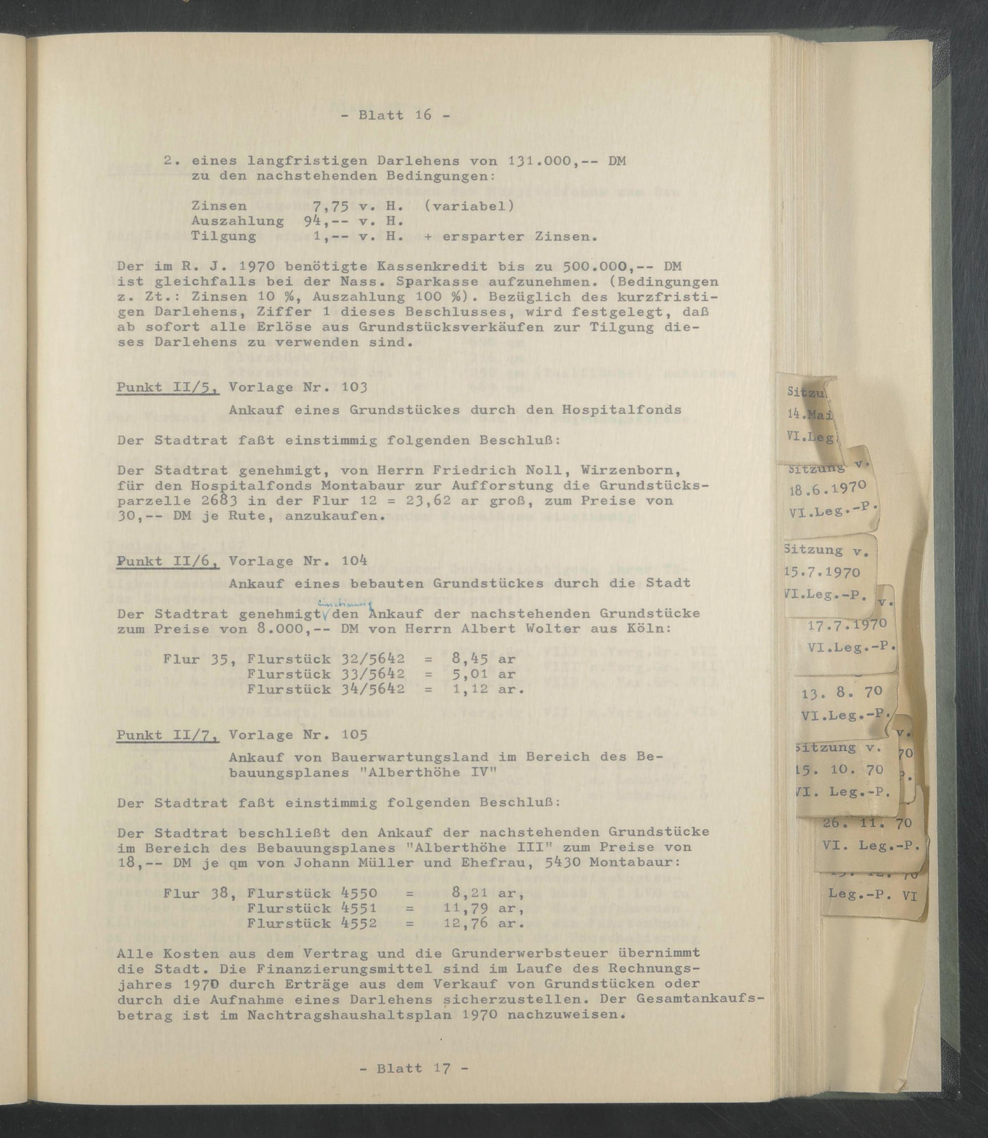 Alle Kosten aus dem Vertrag und die Grunderwerbsteuer übernimmt die Stadt. Die Finanzierungsmittel sind im Laufe des Rechnungsjahres 1970 durch Erträge aus dem Verkauf von Grundstücken oder durch die Aufnahme eines Darlehens sicherzustellen. Der Gesamtankaufsbetrag ist im Nachtragshaushaltsplan 1970 nachzuweisen.