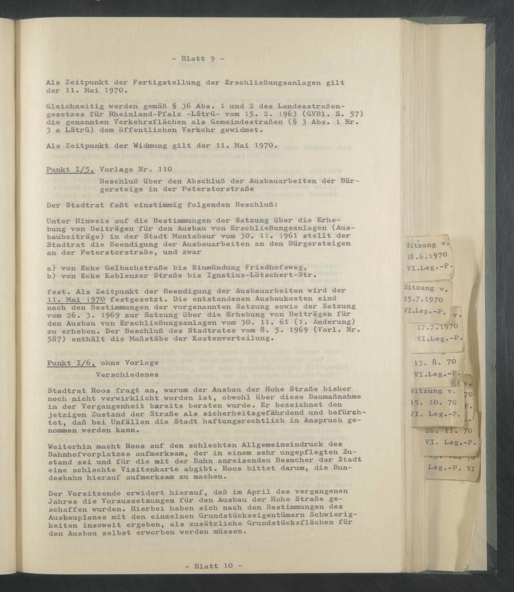 Unter Hinweis auf die Bestimmungen der Satzung über die Erhebung von Beiträgen für den Ausbau von Erschließungsanlagen (Ausbaubeiträge) in der Stadt Montabaur vom 30. 11. 1961 stellt der Stadtrat die Beendigung der Ausbauarbeiten an den Bürgersteigen an der Peterstorstraße, und zwar