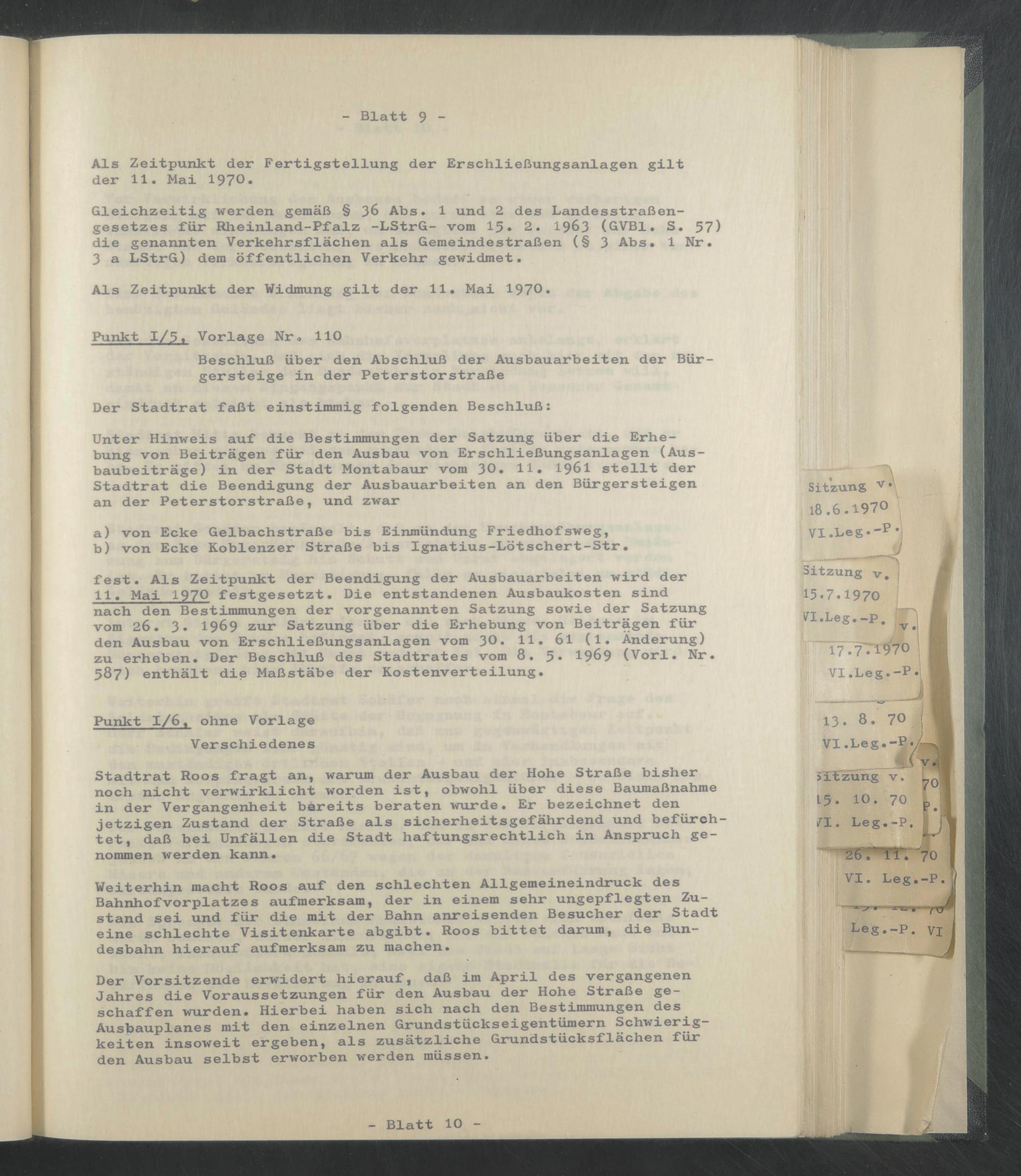 fest. Als Zeitpunkt der Beendigung der Ausbauarbeiten wird der 11. Mai 1970 festgesetzt. Die entstandenen Ausbaukosten sind nach den Bestimmungen der vorgenannten Satzung sowie der Satzung vom 26. 3. 1969 zur Satzung über die Erhebung von Beiträgen für den Ausbau von Erschließungsanlagen vom 30. 11. 6 l (1. Änderung) zu erheben. Der Beschluß des Stadtrates vom 8 . 5* 1969 (Vorl. Nr. 587 ) enthält die Maßstäbe der Kostenverteilung.