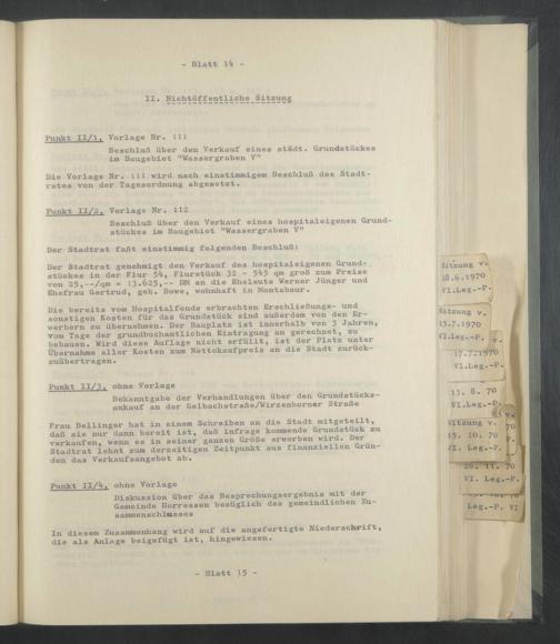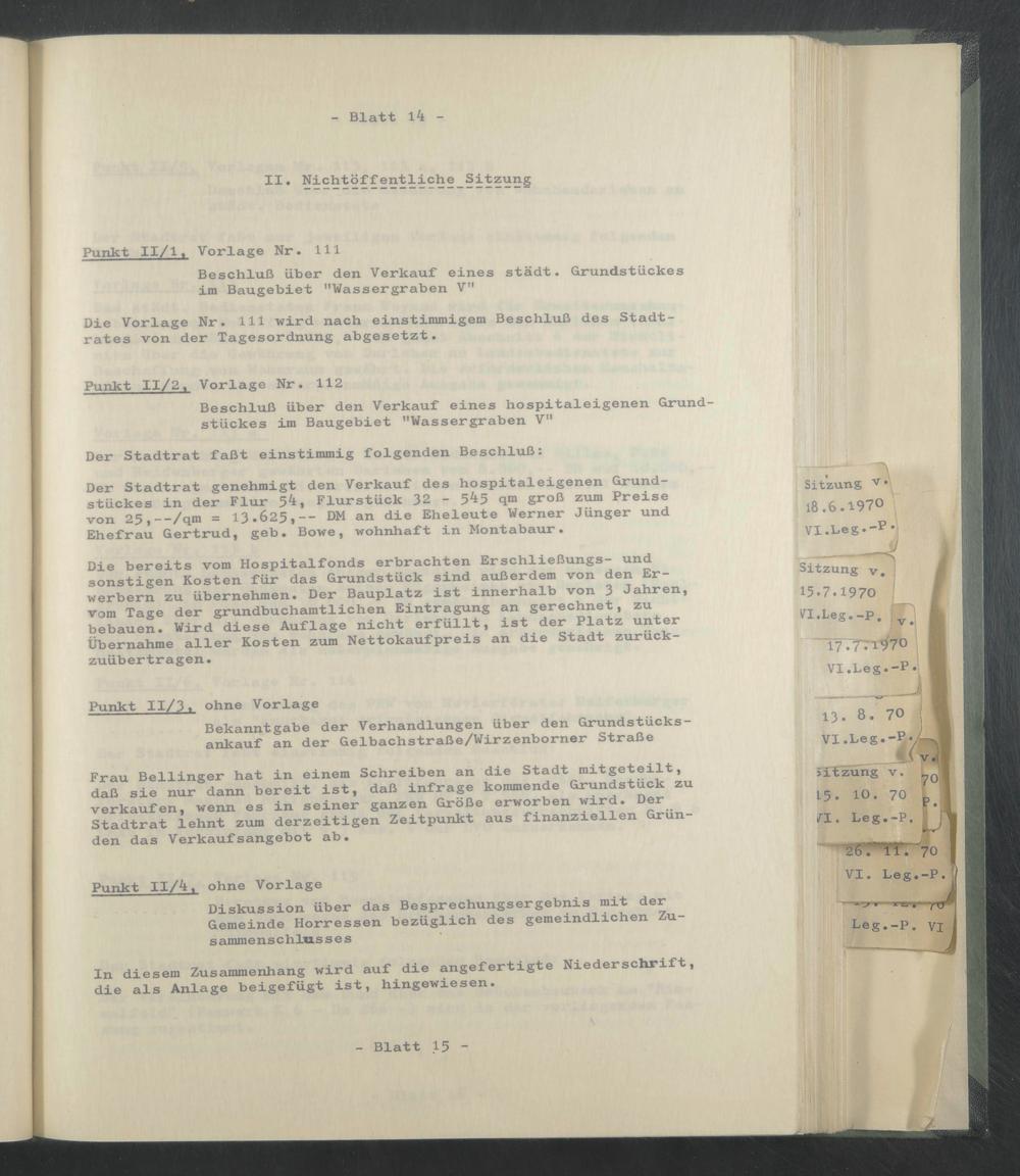 Der Stadtrat genehmigt den Verkauf des hospitaleigenen Grundstückes in der Flur 5^, Flurstück 32 - 545 qm groß zum Preise von 25,--/qm = 13*625,-- DM an die Eheleute Werner Jünger und Ehefrau Gertrud, geb. Bowe, wohnhaft in Montabaur.