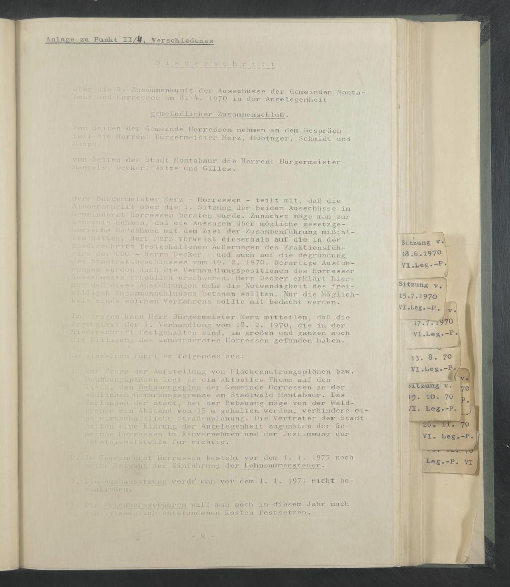 Im übrigen kann Herr Bürgermeister Merz mitteilen, daß die Ergebnisse der 1. Verhandlung vom 18 . 2 . 1970, die in der Niederschrift festgehaJten sind, im großen und ganzen auch die Billigung des Gemeinderates Horressen gefunden haben.