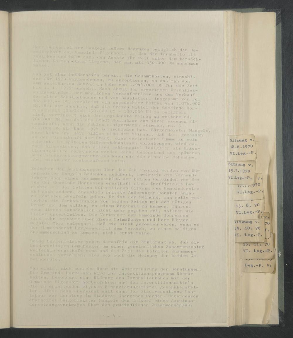 Man einigt sich nunmehr über die Weiterführung der Beratungen. Die Gemeinde Horressen wird ihr Investitionsprogramm überarbeiten, besonders eine Klärung des Turnhallenbaues mit der Gemeinde Elgendorf horbeiführen und den Investitionsmitteln die zu erwartenden eigenen Finauzierungsmittel gegenüberstel- J.en Diese neue Übersicht soll daun der Stadtverwaltung Montabaur zur Beratung im Stadtrat übergeben werden, Unterdessen erarbeitet Bürgermeister Mangels den Entwurf eines Auseinan- dersetz.ungsvertrages über den gemeindlichen Zusammenschluß.