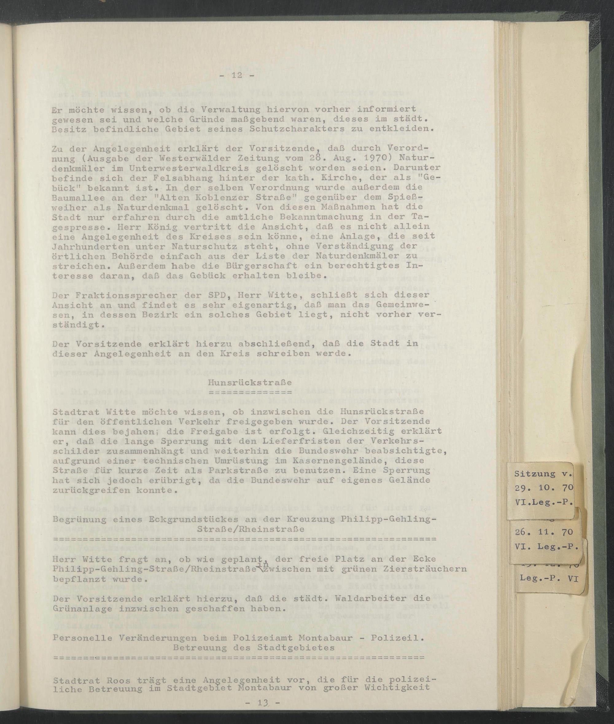 Zu der Angelegenheit erklärt der Vorsitzende, daß durch Verordnung (Ausgabe der Westerwälder Zeitung vom 28. Aug. 1970) Naturdenkmäler im Unterwesterwaldkreis gelöscht worden seien. Darunter befinde sich der Felsabhang hinter der kath. Kirche, der als "Gebäck" bekannt ist. In der selben Verordnung wurde außerdem die Baumallee an der "Alten Koblenzer Straße" gegenüber dem Spießweiher als Naturdenkmal gelöscht. Von diesen Maßnahmen hat die Stadt nur erfahren durch die amtliche Bekanntmachung in der Tagespresse. Herr König vertritt die Ansicht, daß es nicht allein eine Angelegenheit des Kreises sein könne, eine Anlage, die seit Jahrhunderten unter Naturschutz steht, ohne Verständigung der örtlichen Behörde einfach aus der Liste der Naturdenkmäler zu streichen. Außerdem habe die Bürgerschaft ein berechtigtes Interesse daran, daß das Gebäck erhalten bleibe.