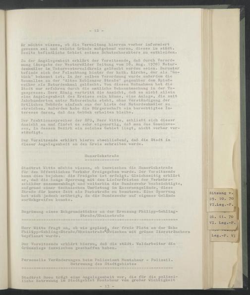Stadtrat Witte möchte wissen, ob inzwischen die Hunsrückstraße für den öffentlichen Verkehr freigegeben wurde. Der Vorsitzende kann dies bejahen; die Freigabe ist erfolgt. Gleichzeitig erklärt er, daß die lange Sperrung mit den Lieferfristen der Verkehrsschilder zusammenhängt und weiterhin die Bundeswehr beabsichtigte, aufgrund einer technischen Umrüstung im Kasernengelände, diese Straße für kurze Zeit als Parkstraße zu benutzen. Eine Sperrung hat sich jedoch erübrigt, da die Bundeswehr auf eigenes Gelände zurückgreifen konnte.