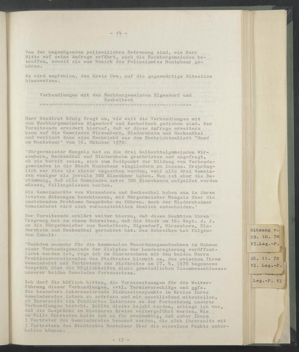 'Bürgermeister Mangels hat an die drei Gelbachtalgemeinden Wirzenborn, Reckenthal und Bladernheim geschrieben und angefragt, ob sie bereit seien, sich zum Zeitpunkt der Bildung von Verbandsgemeinden in die Stadt Montabaur eingliedern zu lassen. Ursprünglich war dies als sicher angesehen worden, weil alle drei Gemeinden weniger als jeweils 300 Einwohner haben. Nun ist aber die Bestimmung, daß alle Gemeinden unter 300 Einwohnern aufgelöst werden müssen, fallengelassen worden.