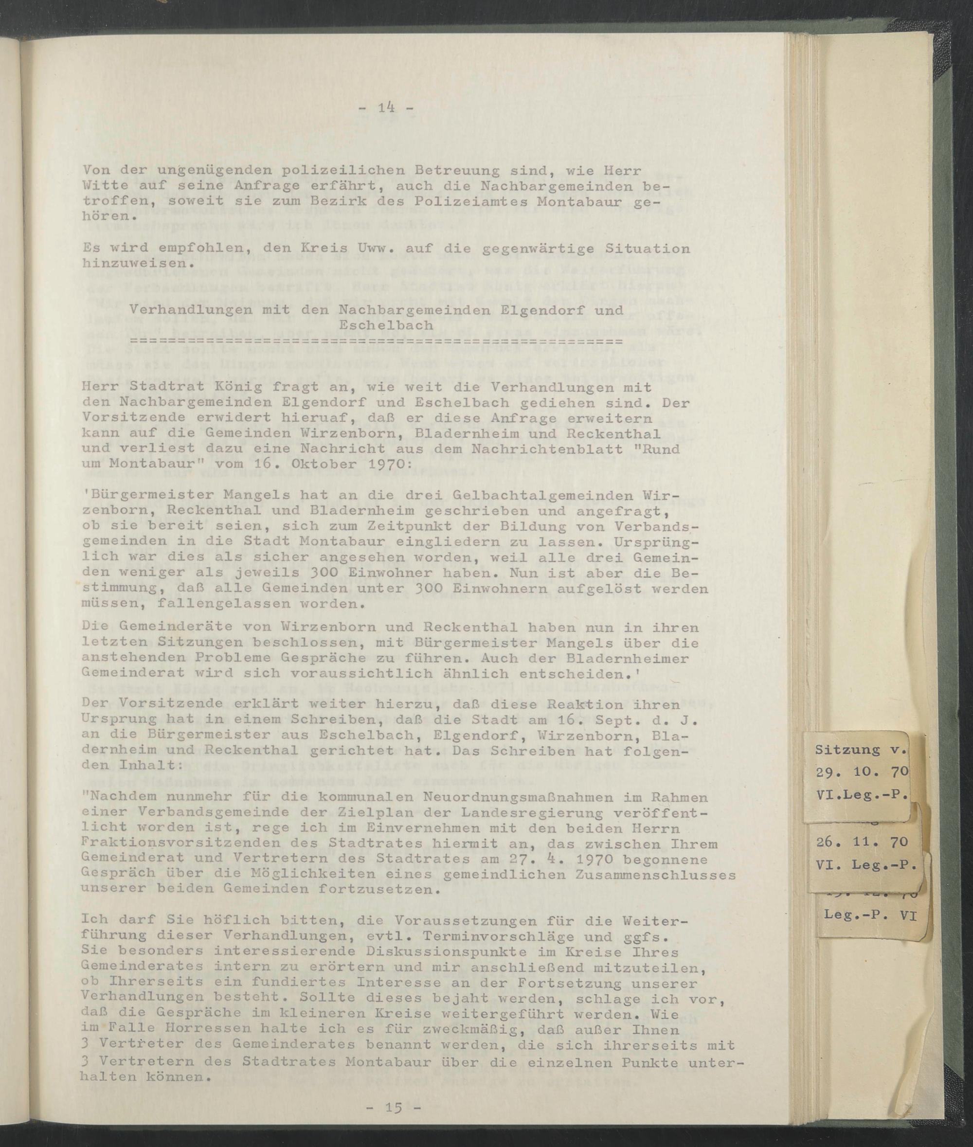 Herr Stadtrat König fragt an, wie weit die Verhandlungen mit den Nachbargemeinden Eigendorf und Eschelbach gediehen sind. Der Vorsitzende erwidert hieruaf, daß er diese Anfrage erweitern kann auf die Gemeinden Wirzenborn, Bladernheim und Reckenthal und verliest dazu eine Nachricht aus dem Nachrichtenblatt "Rund um Montabaur" vom 16. Oktober 1970: