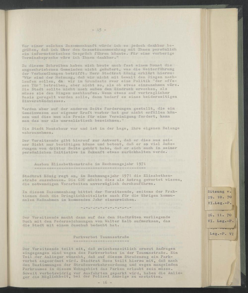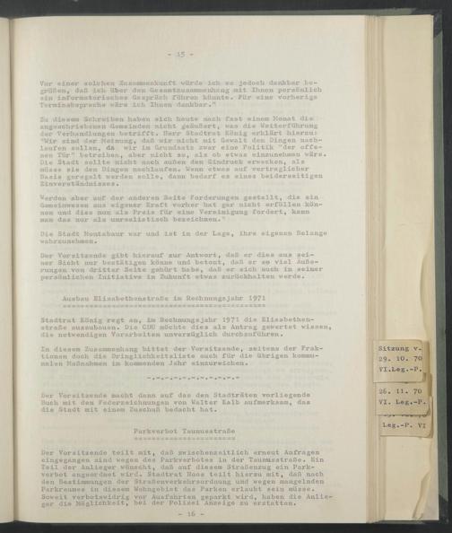 Stadtrat König regt an, im Rechnungsjahr 1971 die Elisabethenstraße auszubauen. Die CDU möchte dies als Antrag gewertet wissen, die notwendigen Vorarbeiten unverzüglich durchzuführen.