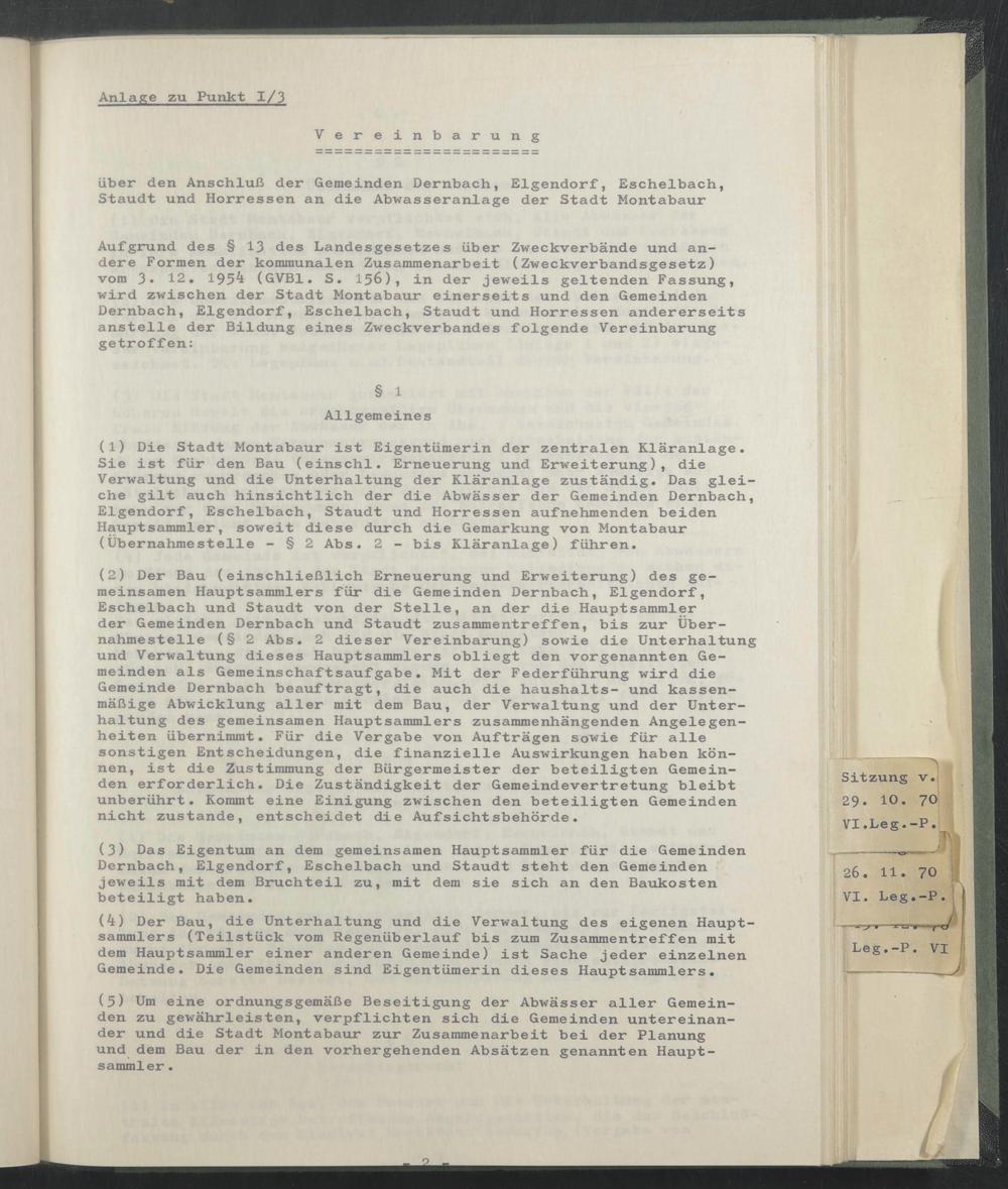 Aufgrund des § lß des Landesgesetzes über Zweckverbände und andere Formen der kommunalen Zusammenarbeit (Zweckverbandsgesetz) vom ß. 12. 1954 (GVB1. S. 156), in der jeweils geltenden Fassung, wird zwischen der Stadt Montabaur einerseits und den Gemeinden Dernbach, Eigendorf, Eschelbach, Staudt und Horressen andererseits anstelle der Bildung eines Zweckverbandes folgende Vereinbarung getroffen: