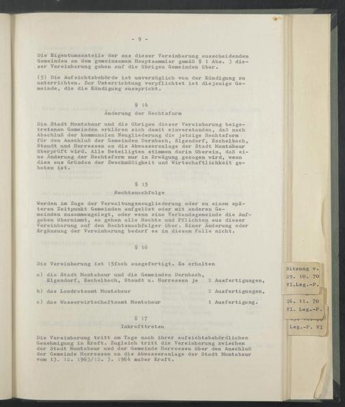 Die Stadt Montabaur und die übrigen dieser Vereinbarung beigetretenen Gemeinden erklären sich damit einverstanden, daß nach Abschluß der kommunalen Neugliederung die jetzige Rechtsform für den Anschluß der Gemeinden Dernbach, Eigendorf, Eschelbach, Staudt und Horressen an die Abwasseranlage der Stadt Montabaur überprüft wird. Alle Beteiligten stimmen darin überein, daß eine Änderung der Rechtsform nur in Erwägung gezogen wird, wenn dies aus Gründen der Zweckmäßigkeit und Wirtschaftlichkeit geboten ist.