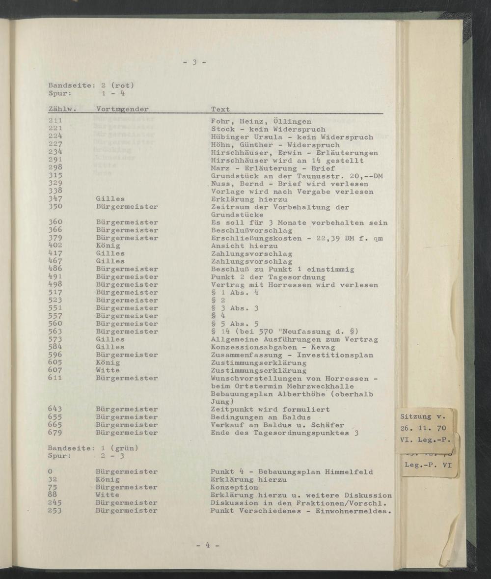 Fohr, Heinz, Öllingen Stock - kein Widerspruch Hübinger Ursula - kein Widerspruch Höhn, Günther - Widerspruch Hirschhäuser, Erwin - Erläuterungen Hirschhäuser wird an 14 gestellt Marz - Erläuterung - Brief Grundstück an der Taunusstr. 20,—DM Nuss, Bernd - Brief wird verlesen Vorlage wird nach Vergabe verlesen Erklärung hierzu Zeitraum der Vorbehaltung der Grundstücke