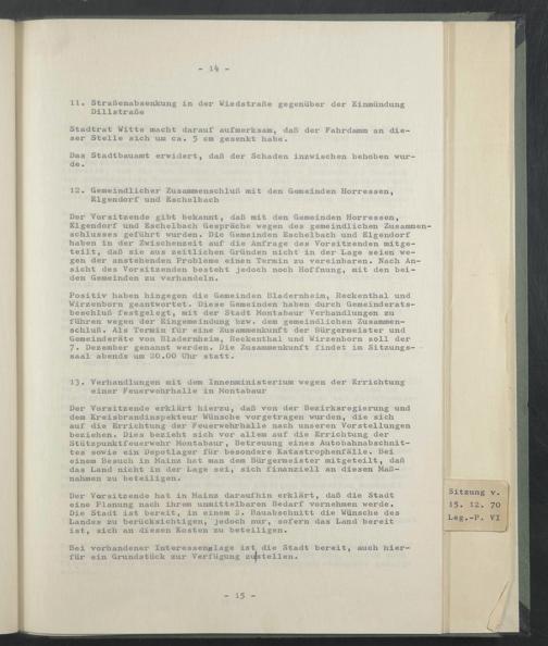 Positiv haben hingegen die Gemeinden Bladernheim, Reckenthal und Wirzenborn geantwortet. Diese Gemeinden haben durch Gemeinderatsbeschluß festgelegt, mit der Stadt Montabaur Verhandlungen zu führen wegen der Eingemeindung bzw. dem gemeindlichen Zusammenschluß. Als Termin für eine Zusammenkunft der Bürgermeister und Gemeinderäte von Bladernheim, Reckenthal und Wirzenborn soll der 7. Dezember genannt werden. Die Zusammenkunft findet im Sitzungs- - saal abends um 20.00 Uhr statt.