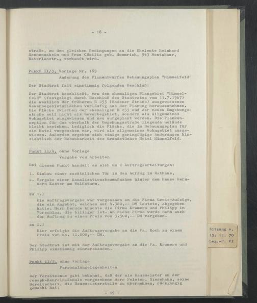 Der Stadtrat beschließt, von dem ehemaligen Plangebiet "Himmelfeld" (festgelegt durch Beschluß des Stadtrates vom 11.7.1967) die westlich der früheren B 255 (Bodener Straße) ausgewiesenen Gewerbegebietsflächen vorläufig aus der Planung herauszunehmen. Die Fläche zwischen der ehemaligen B 255 und der neuen Umgehungsstraße soll nicht als Gewerbegebiet, sondern als allgemeines Wohngebiet ausgewiesen und neu aufgeplant werden. Die Plankonzeption für das oberhalb der Umgehungsstraße liegende Gelände bleibt bestehen. Lediglich die Fläche, die im Bebauungsplan für ein Hotel vorgesehen war, wird als allgemeines Wohngebiet ausgewiesen. Außerdem ergeben sich einige geringfügige Änderungen hinsichtlich der Bebaubarkeit des Grundstückes Hotel Himmelfeld.