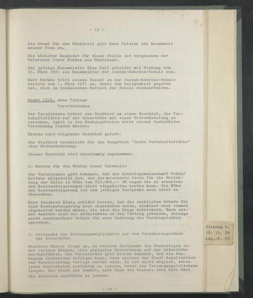 Der jetzige Hausmeister Theo Wolf scheidet mit Wirkung vom 31. März 1971 als Hausmeister der Joseph-Kehreln-Schule aus.