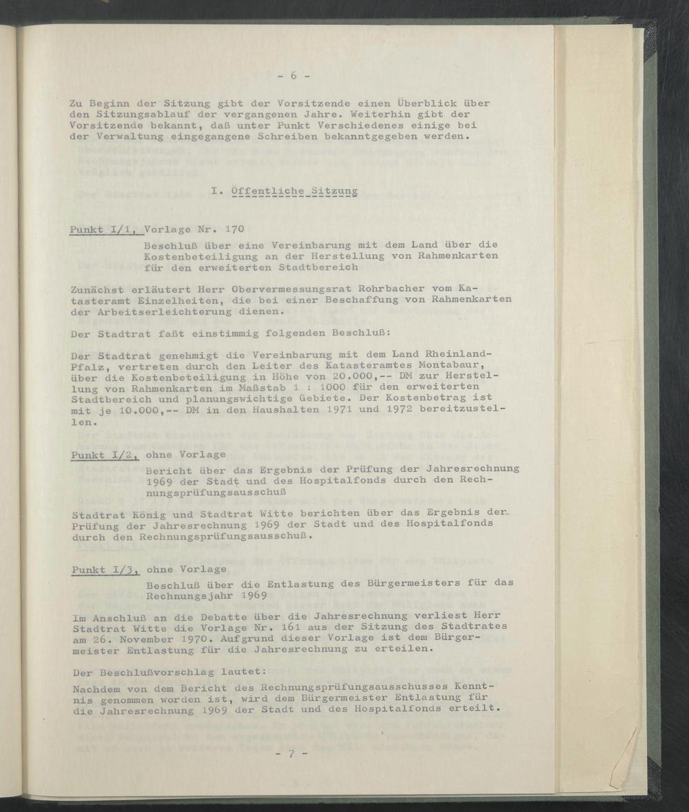 Der Stadtrat genehmigt die Vereinbarung mit dem Land Rheinland- Pfalz, vertreten durch den Leiter des Katasteramtes Montabaur, über die Kostenbeteiligung in Höhe von 20.000,-- DM zur Herstellung von Rahmenkarten im Maßstab 1 : 1000 für den erweiterten Stadtbereich und planungswichtige Gebiete. Der Kostenbetrag ist mit je 10.000,-- DM in den Haushalten 1971 und 1972 bereitzustellen.