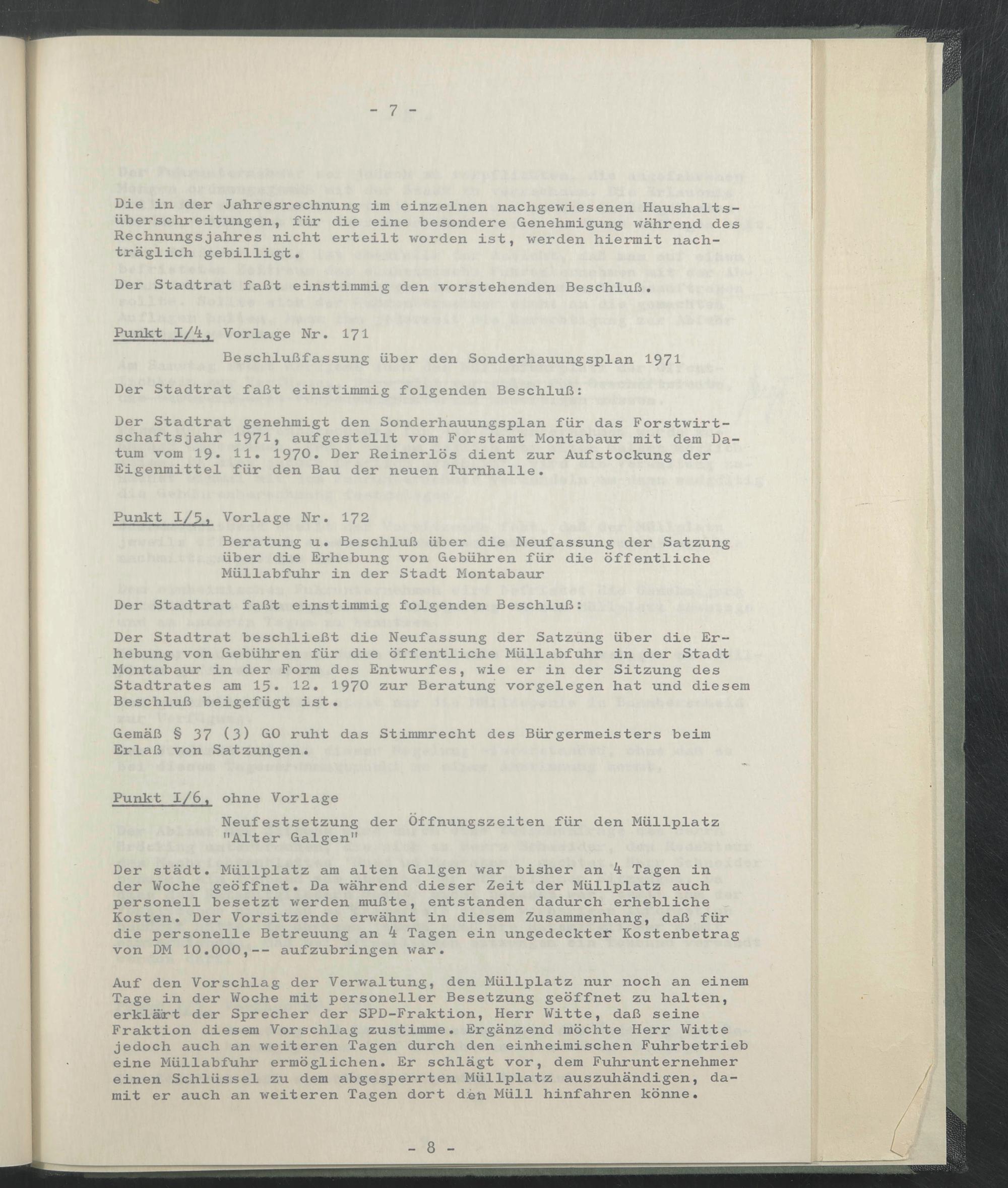 Der Stadtrat beschließt die Neufassung der Satzung über die Erhebung von Gebühren für die öffentliche Müllabfuhr in der Stadt Montabaur in der Form des Entwurfes, wie er in der Sitzung des Stadtrates am 15. 12. 1970 zur Beratung Vorgelegen hat und diesem Beschluß beigefügt ist.