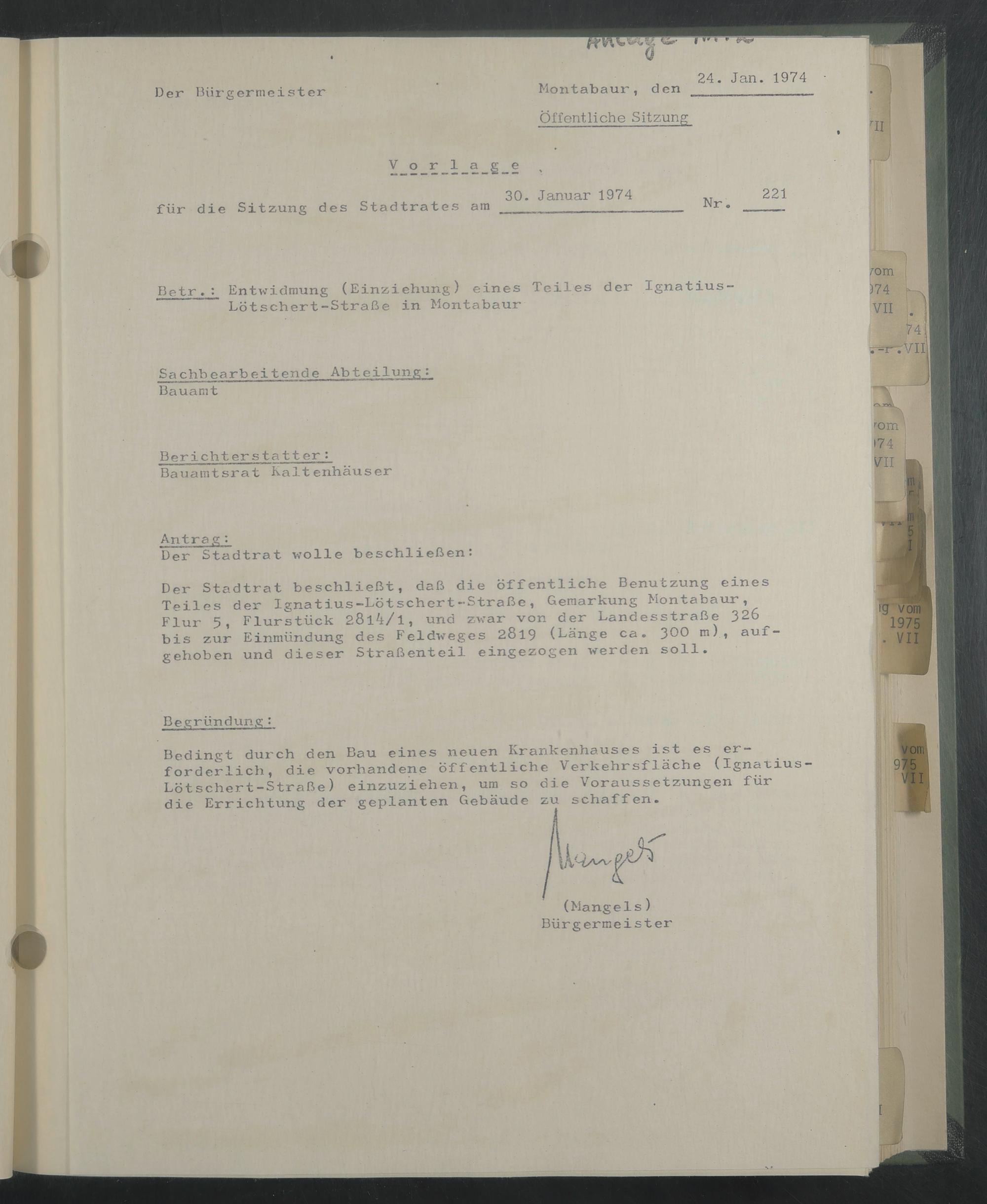 Der Stadtrat beschließt, daß die öffentliche Benutzung eines Teiles der Ignatius-Lötschcrt-Straße, Gemarkung Montabaur, Flur 5, Flurstück 28l4/l, und zwar von der Landesstraße 326 bis zur Einmündung des Feldweges 2819 (Länge ca. ßOO m), aufgehoben und dieser Straßenteil eingezogen werden soll.