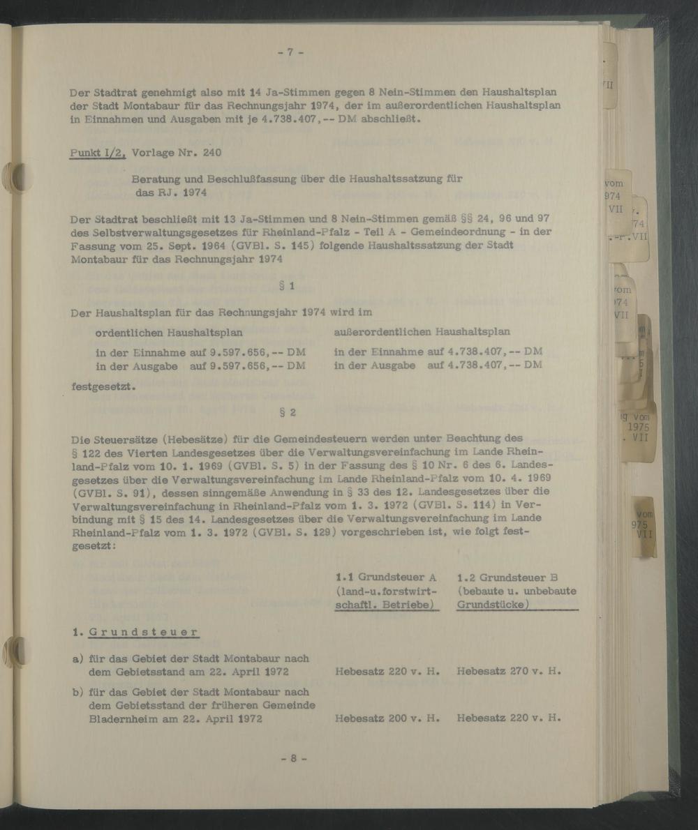 Der Stadtrat genehmigt also mit 14 Ja-Stimmen gegen 8 Nein-Stimmen den Haushaltsplan der Stadt Montabaur für das Rechnungsjahr 1974, der im außerordentlichen Haushaltsplan in Einnahmen und Ausgaben mit je 4.738.407, — DM abschließt.