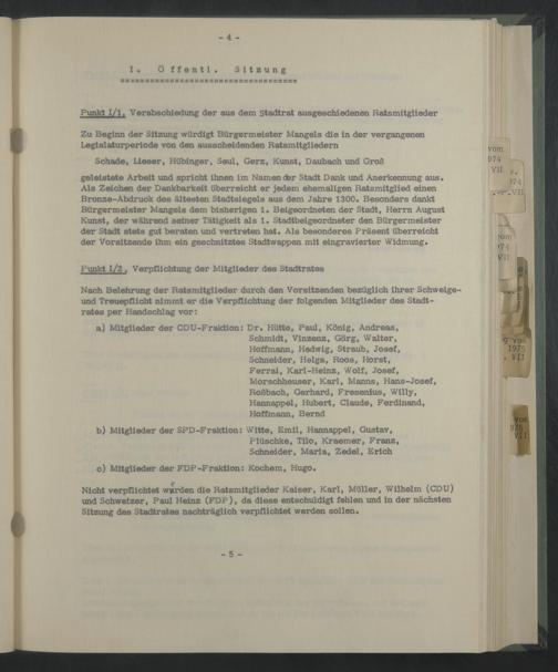 Nicht verpflichtet werden die Ratsmitglieder Kaiser, Karl, Müller, Wilhelm (CDU) und Schweizer, Paul Heinz (FDP), da diese entschuldigt fehlen und in der nächsten Sitzung des Stadtrates nachträglich verpflichtet werden sollen.