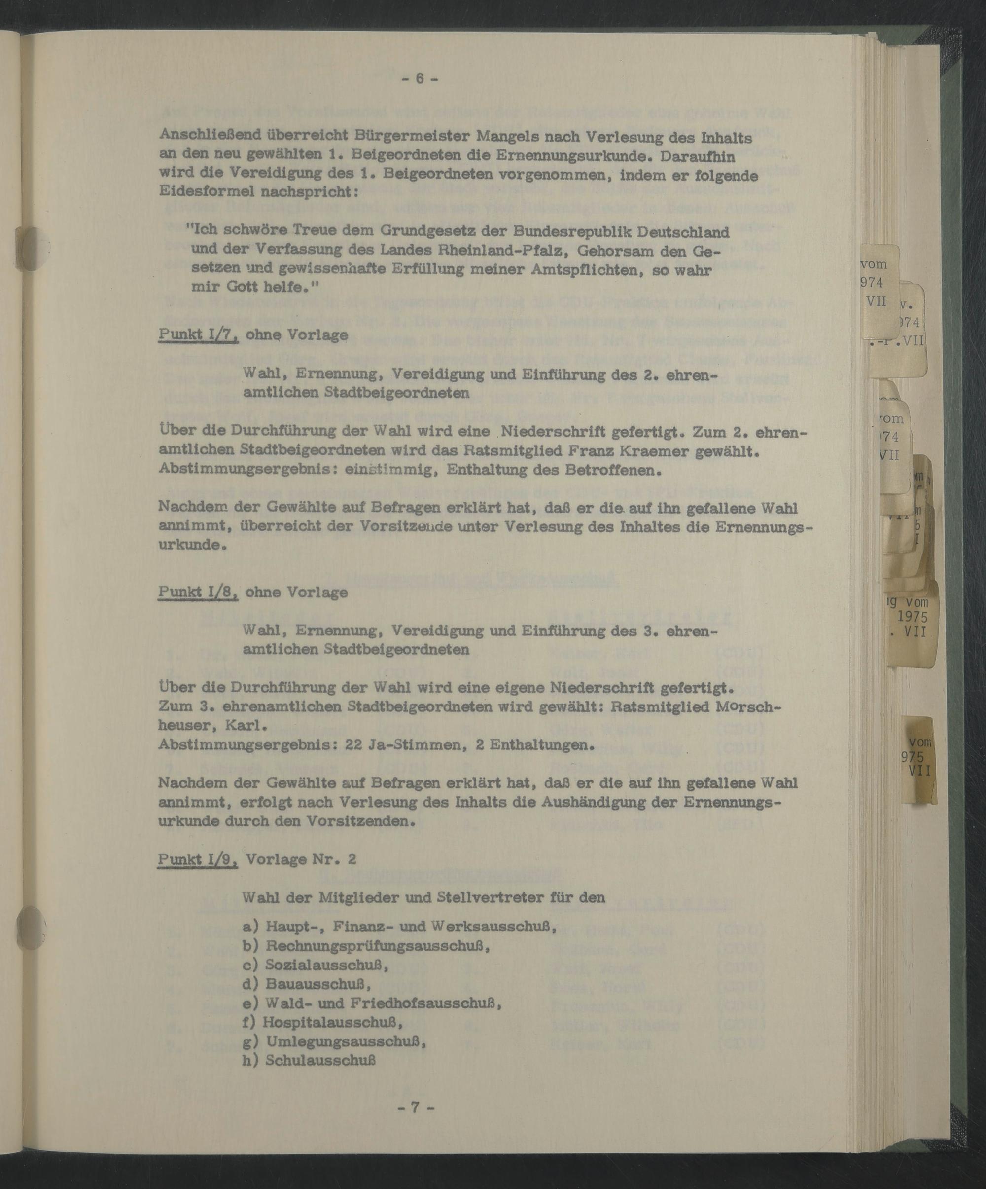 Uber die Durchführung der Wahl wird eine Niederschrift gefertigt. Zum 2. ehrenamtlichen Stadtbeigeordneten wird das Ratsmitglied Franz Kraemer gewählt. Abstimmungsergebnis: einstimmig, Enthaltung des Betroffenen.