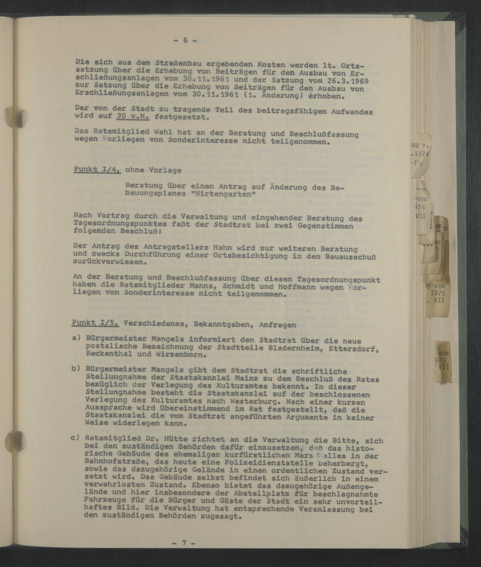 a) Bürgermeister Mangels informiert den Stadtrat Über die neue postalische Bezeichnung der Stadtteile Bladernheim, Ettersdorf, Reckenthal und Wirzenborn.