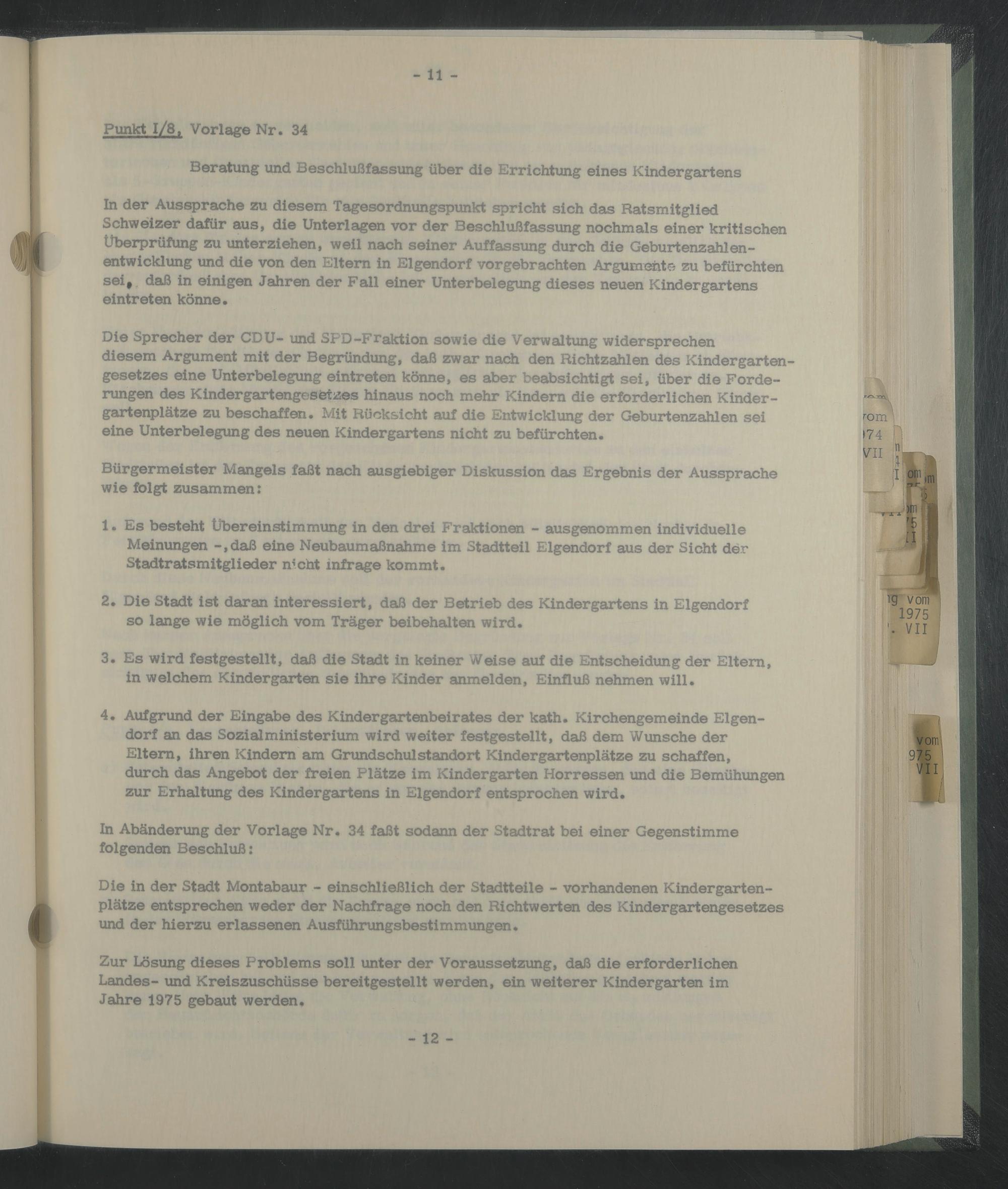 Die Sprecher der CDU- und SPD-Fraktion sowie die Verwaltung widersprechen diesem Argument mit der Begründung, daß zwar nach den Richtzahlen des Kindergartengesetzes eine Unterbelegung eintreten könne, es aber beabsichtigt sei, über die Forderungen des Kindergartengesetzes hinaus noch mehr Kindern die erforderlichen Kindergartenplätze zu beschaffen. Mit Rücksicht auf die Entwicklung der Geburtenzahlen sei eine Unterbelegung des neuen Kindergartens nicht zu befürchten.