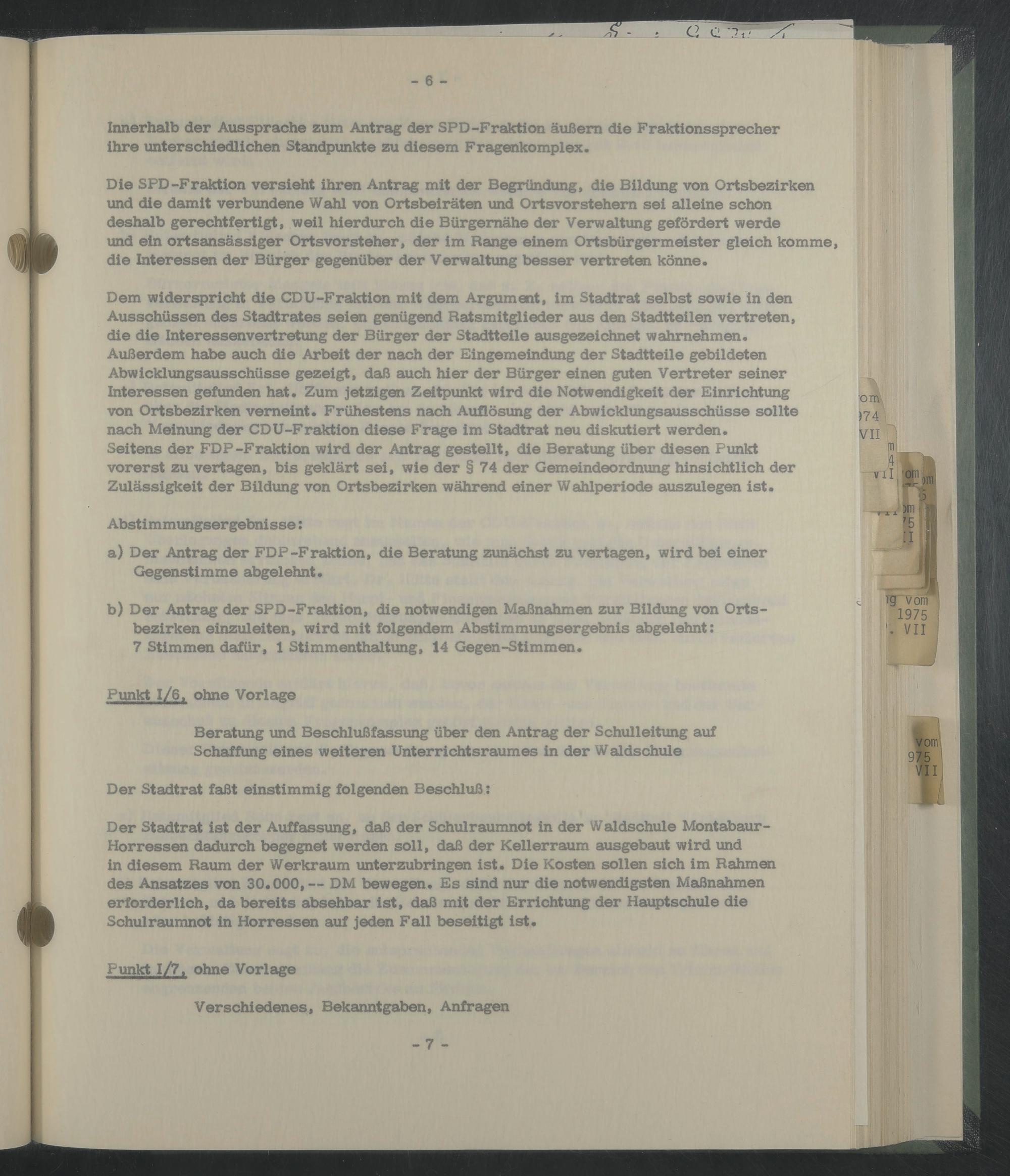 Seitens der FDP-Fraktion wird der Antrag gestellt, die Beratung über diesen Punkt vorerst zu vertagen, bis geklärt sei, wie der § 74 der Gemeindeordnung hinsichtlich der Zulässigkeit der Bildung von Ortsbezirken während einer Wahlperiode auszulegen ist.