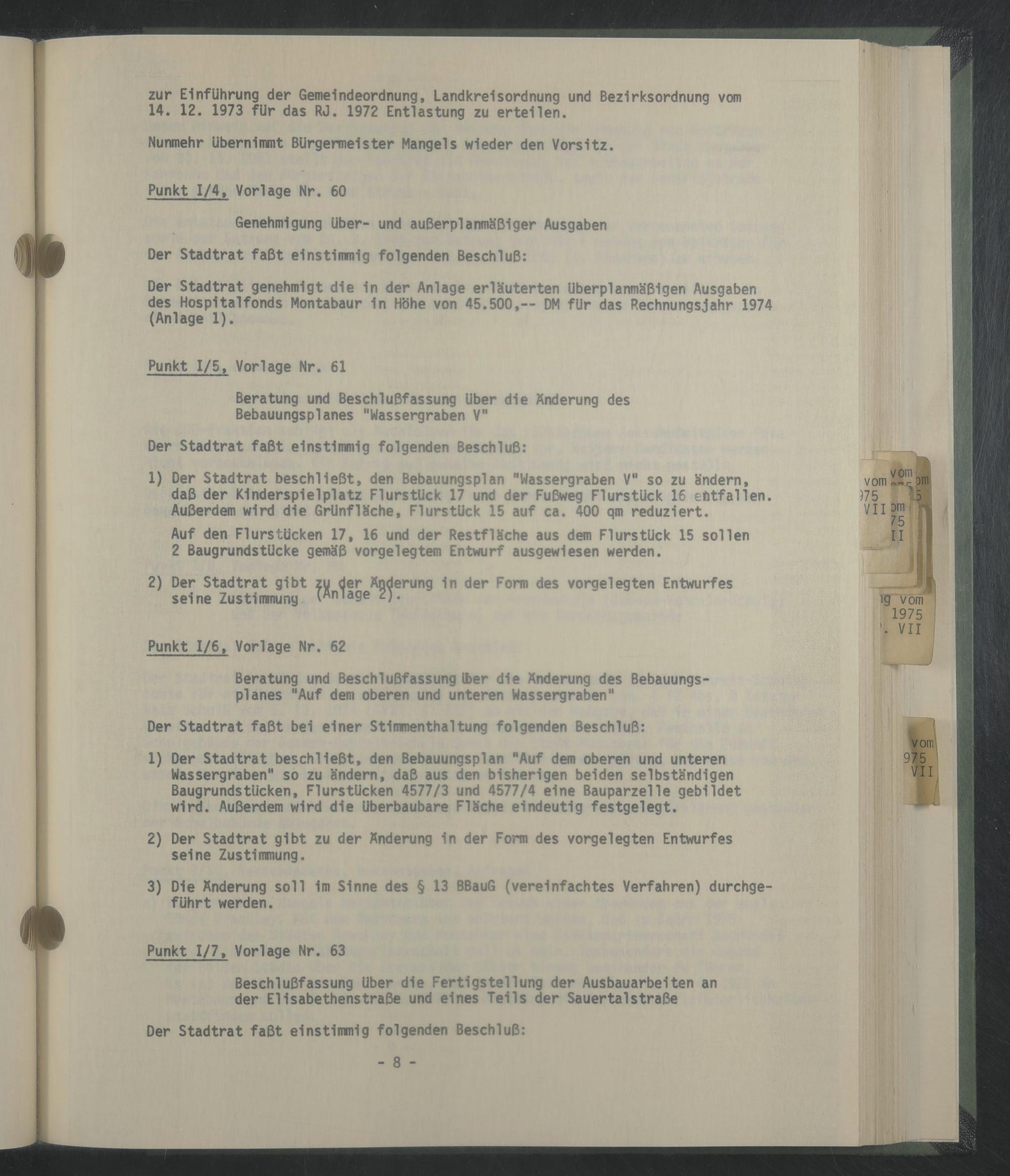 1) Der Stadtrat beschließt, den Bebauungsplan "Wassergraben V" so zu ändern, daß der Kinderspielplatz Flurstück 17 und der Fußweg Flurstück 16 eütfallen. Außerdem wird die Grünfläche, Flurstück 15 auf ca. 400 qm reduziert.