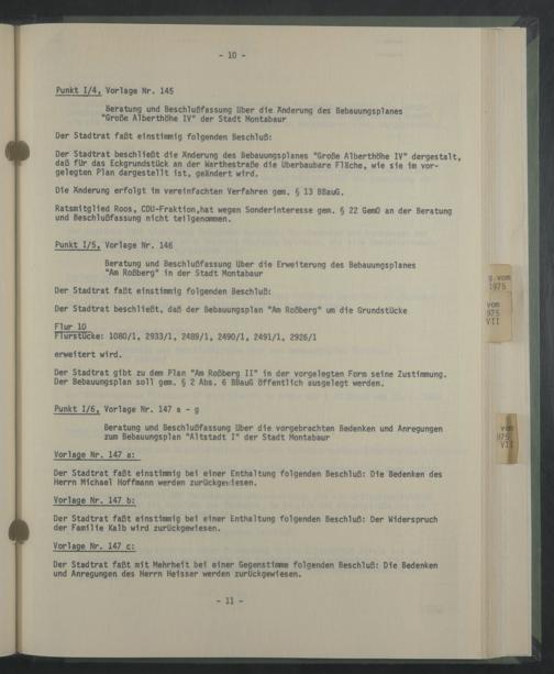 Ratsmitglied Roos, CDU-Frakt1on,hat wegen Sonderinteresse gern. § 22 GemO an der Beratung und Beschlußfassung nicht tellgenommen.