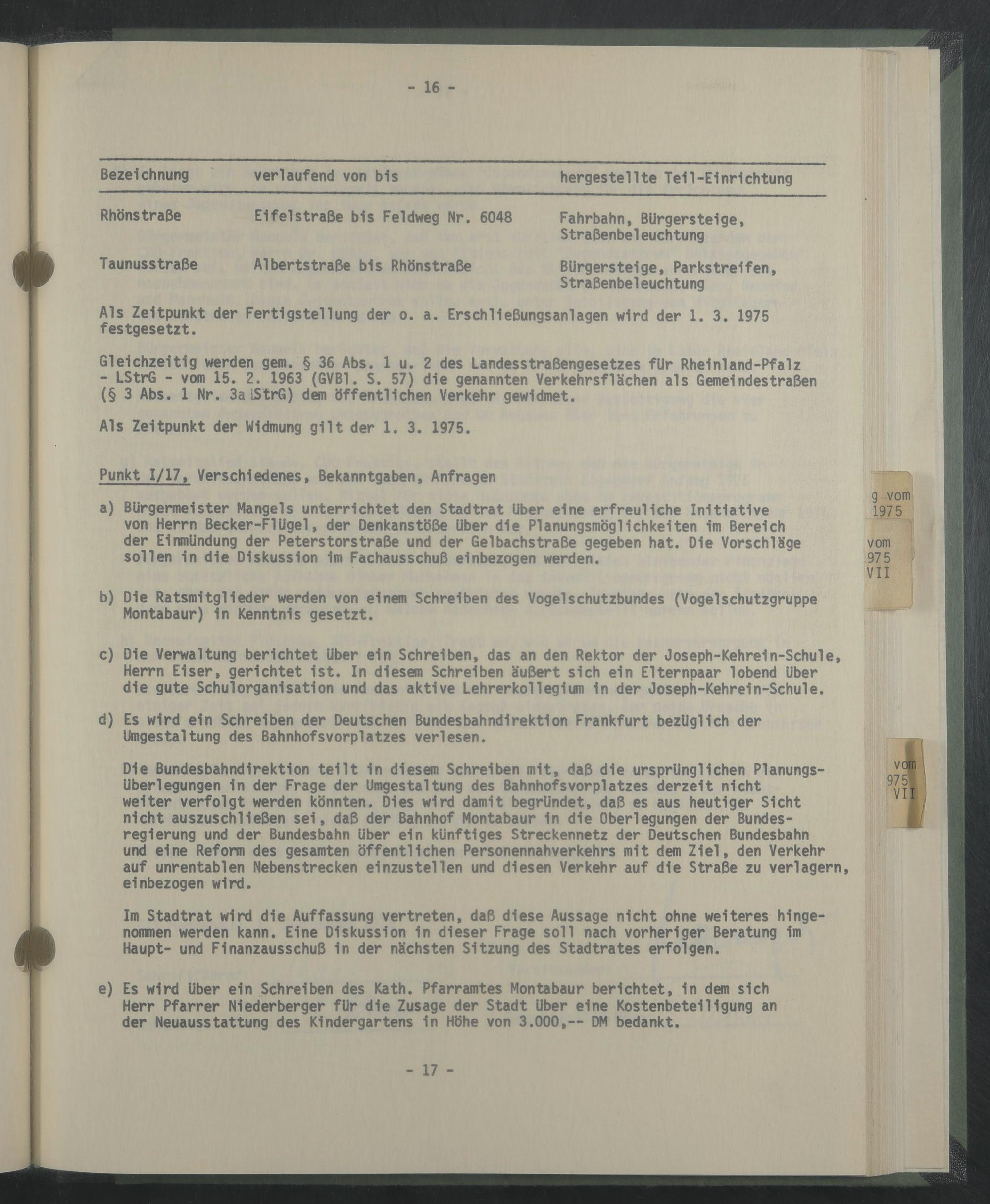 a) Bürgermeister Mangels unterrichtet den Stadtrat Uber eine erfreuliche Initiative 1975