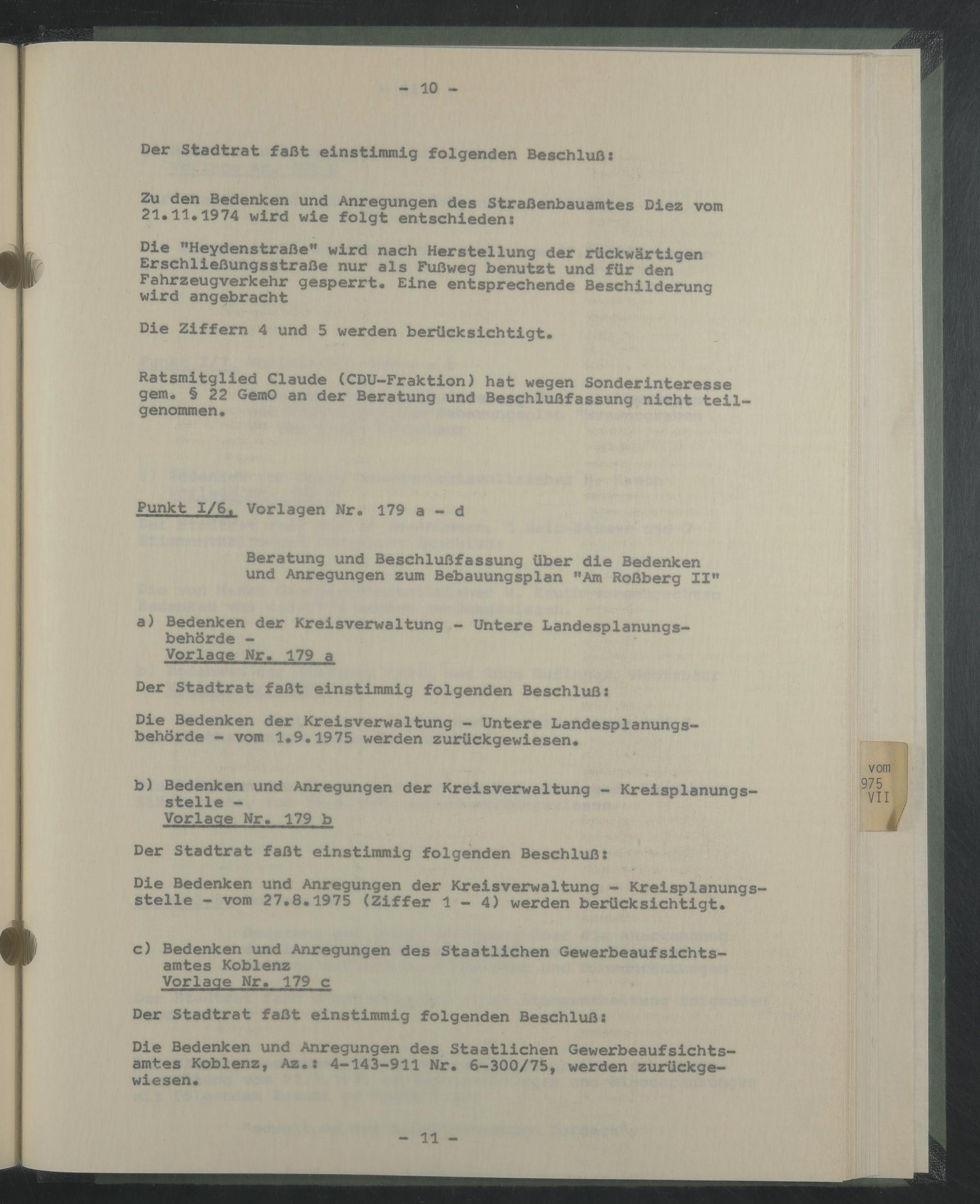 Ratsmitglied Claude (CDU-Fraktion) hat wegen Sonderinteresse gern. § 22 GemO an der Beratung und Beschlußfassung nicht teilgenommen.