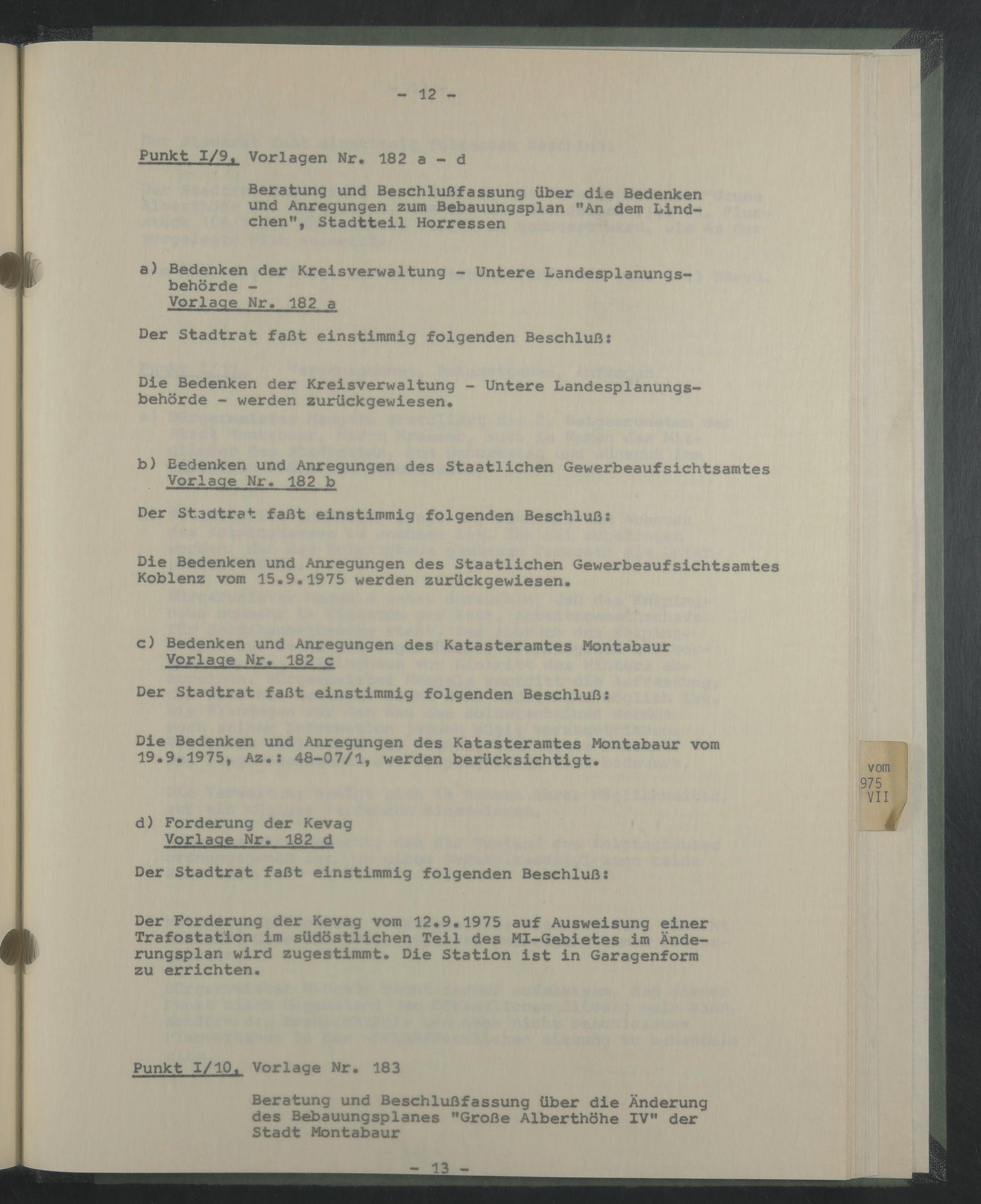 c) Bedenken und Anregungen des Katasteramtes Montabaur Vorlage Nr. 182 c