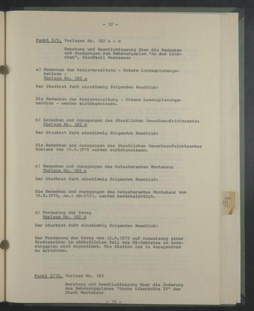 Der Forderung der Kevag vom 12.9.1975 auf Ausweisung einer Trafostation im südöstlichen Teil des MI-Gebietes im Änderungsplan wird zugestimmt. Die Station ist in Garagenform zu errichten.