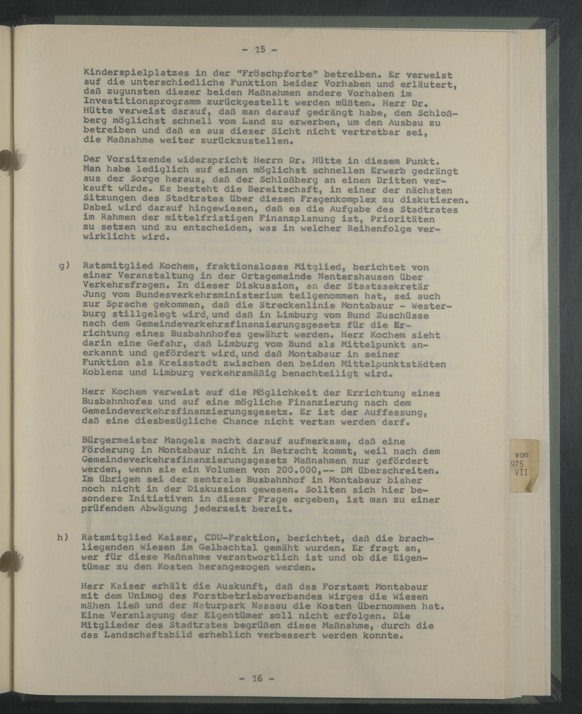 g) Ratsmitglied Kochern, fraktionsloses Mitglied, berichtet von einer Veranstaltung in der Ortsgemeinde Nentershausen über Verkehrsfragen. In dieser Diskussion, an der Staatssekretär Jung vom Bundesverkehrsministerium teilgenommen hat, sei auch zur Sprache gekommen, daß die Streckenlinie Montabaur - Westerburg stillgelegt wird,und daß in Limburg vom Bund Zuschüsse nach dem Gemeindeverkehrsfinanzierungsgesetz für die Errichtung eines Busbahnhofes gewährt werden. Herr Kochern sieht darin eine Gefahr, daß Limburg vom Bund als Mittelpunkt anerkannt und gefördert wird,und daß Montabaur in seiner Funktion als Kreisstadt zwischen den beiden Mittelpunktstädten Koblenz und Limburg verkehrsmäßig benachteiligt wird.