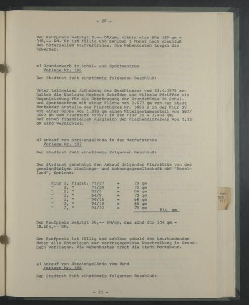 Unter teilweiser Aufhebung des Beschlusses vom 23.4.1975 erhalten die Eheleute Herbert Schröder und Milhelm Pfeiffer als Gegenleistung für die Übertragung der Grundstücke im Schul- und Sportzentrum mit einer Fläche von 2.677 qm von der Stadt Montabaur anstelle des Flurstückes Nr. 5603 b in der Flur 39 mit einer Größe von 1.378 qm einen Miteigentumsanteil von 382/ 1000 an dem Flurstück 5599/3 in der Flur 39 - 3.404 qm.
