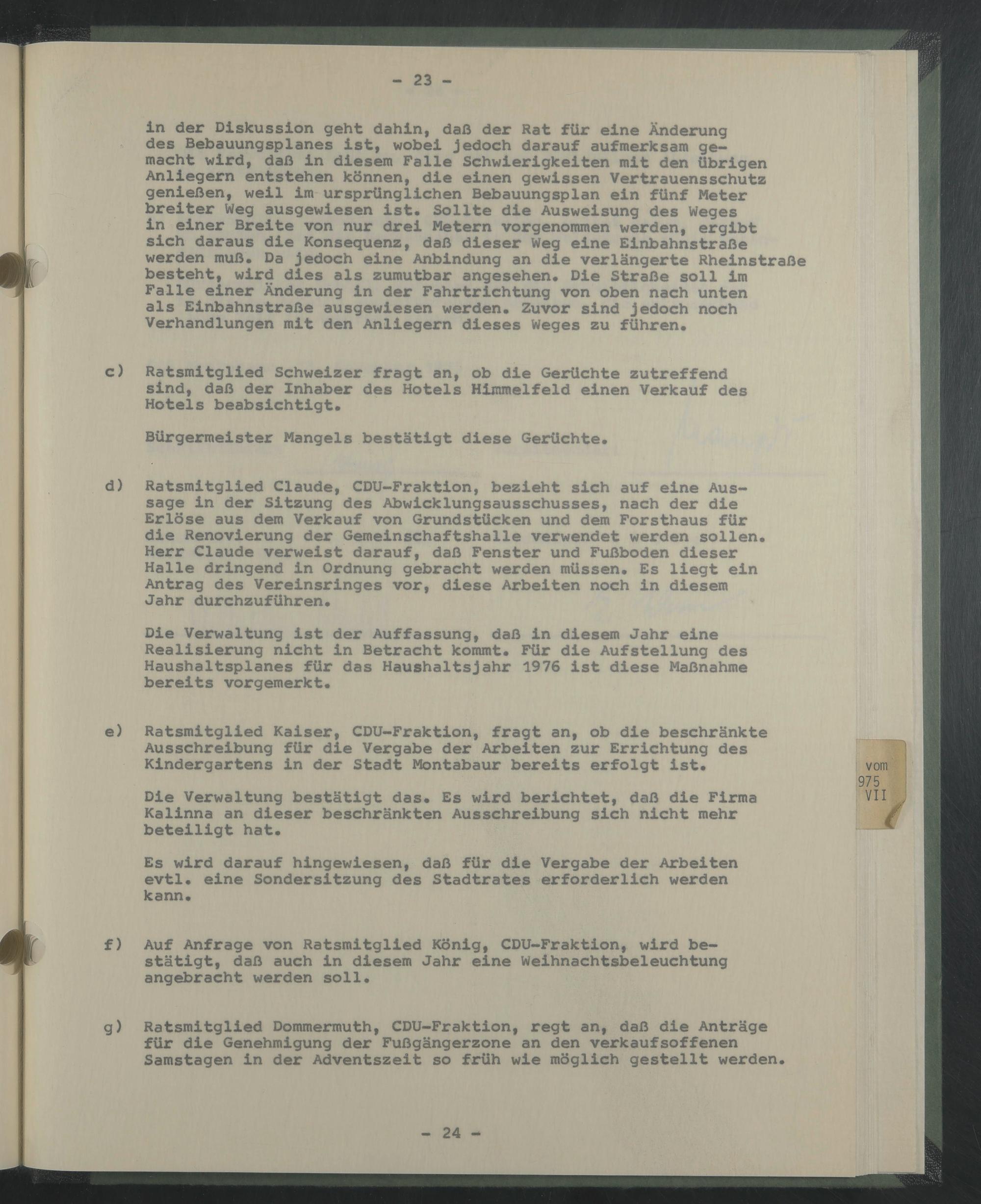 Die Verwaltung ist der Auffassung, daß in diesem Jahr eine Realisierung nicht in Betracht kommt. Für die Aufstellung des Haushaltsplanes für das Haushaltsjahr 1976 ist diese Maßnahme bereits vorgemerkt.