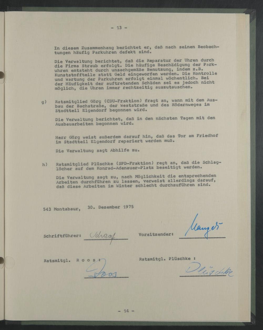 Die Verwaltung berichtet, daß die Reparatur der Uhren durch die Firma Straub erfolgt. Die häufige Beschädigung der Parkuhren entsteht durch unsachgemäße Benutzung, indem z.B. Kunststoffteile statt Geld eingeworfen werden. Die Kontrolle und Wartung der Parkuhren erfolgt einmal wöchentlich. Bei der Häufigkeit der auftretenden Schäden sei es jedoch nicht möglich, die Uhren immer rechtzeitig auszutauschen.