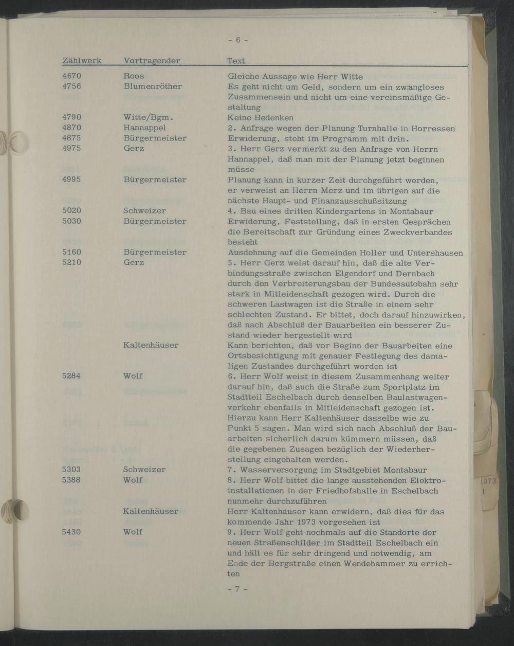 6. Herr Wolf weist in diesem Zusammenhang weiter darauf hin, daß auch die Straße zum Sportplatz im Stadtteil Eschelbach durch denselben Baulastwagenverkehr ebenfalls in Mitleidenschaft gezogen ist.