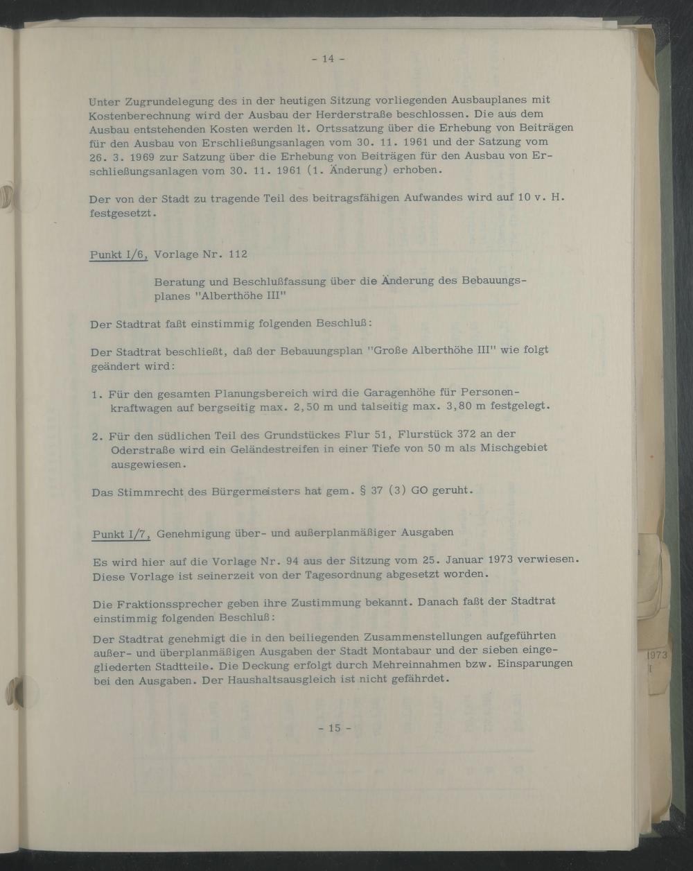 Unter Zugrundelegung des in der heutigen Sitzung vorliegenden Ausbauplanes mit Kostenberechnung wird der Ausbau der Herderstraße beschlossen. Die aus dem Ausbau entstehenden Kosten werden lt. Ortssatzung über die Erhebung von Beiträgen für den Ausbau von Erschließungsanlagen vom 30. 11. 1961 und der Satzung vom 26. 3. 1969 zur Satzung über die Erhebung von Beiträgen für den Ausbau von Erschließungsanlagen vom 30. 11. 1961 (l. Änderung) erhoben. t