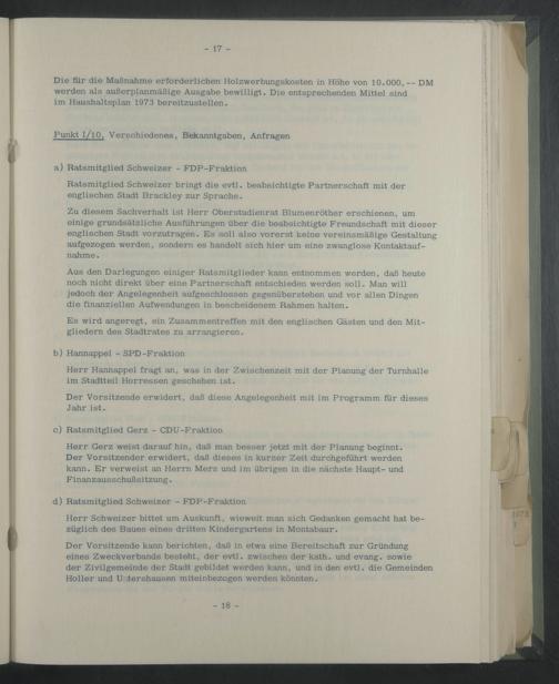 Zu diesem Sachverhalt ist Herr Ober Studienrat Blumenröther erschienen, um einige grundsätzliche Ausführungen über die beabsichtigte Freundschaft mit dieser englischen Stadt vorzutragen. Es soll also vorerst keine vereinsmäßige Gestaltung aufgezogen werden, sondern es handelt sich hier um eine zwanglose Kontaktaufnahme.