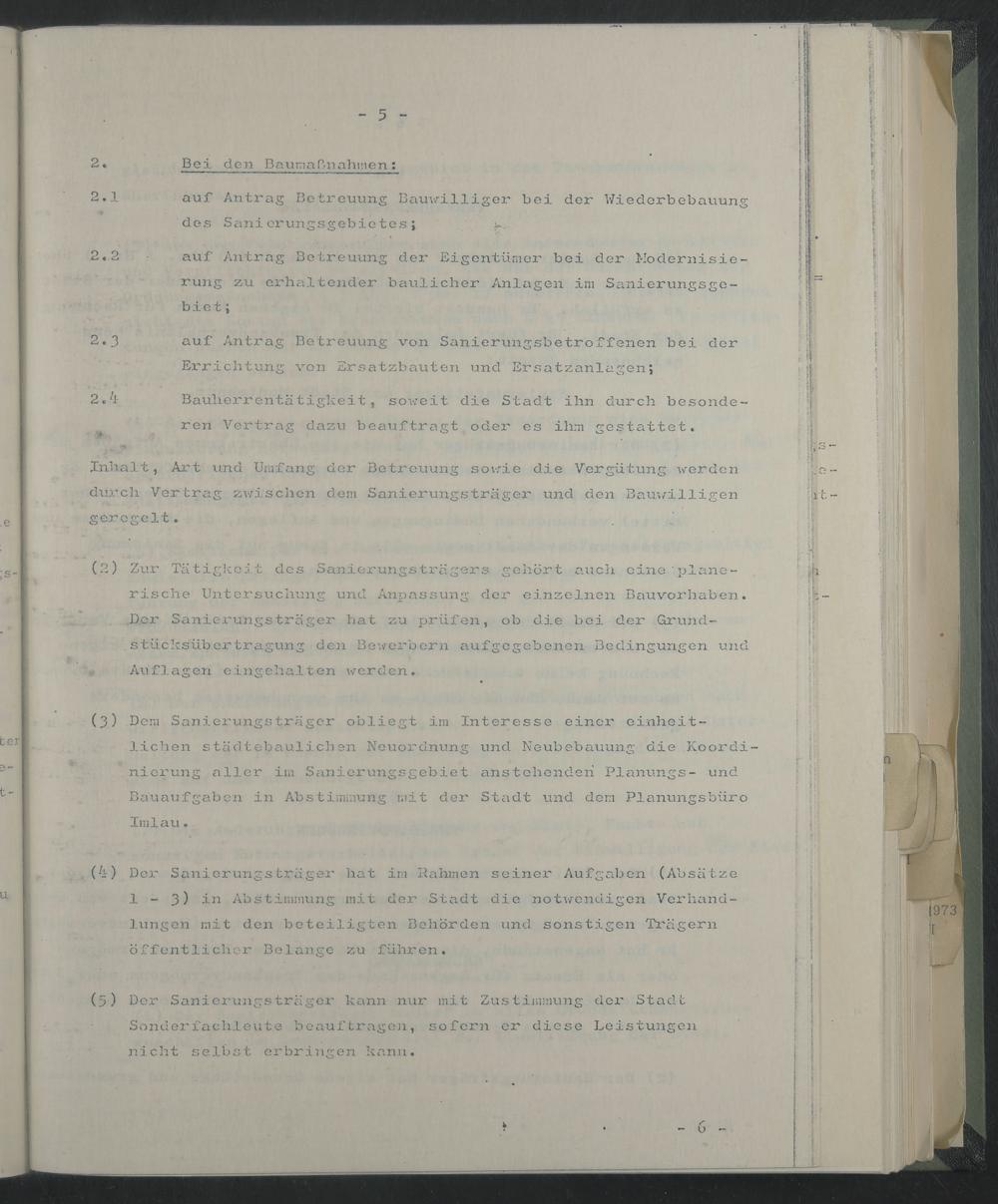 (ß) Dem Sanierungsträger obliegt im Interesse einer einheitlichen städtebaulichen Neuordnung und Neubebauung die Koordinierung aller im Sanierungsgebiet anstehenden Planungs- und Bäuaufgaben in Abstimmung mit der Stadt und dem Planungsbüro Imlau.