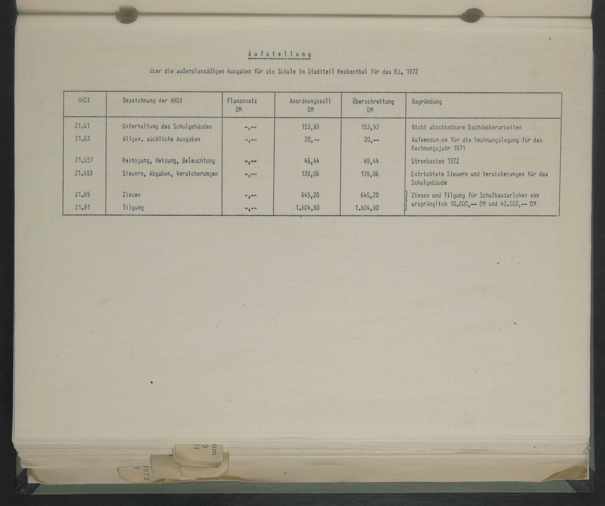 über die auQerplan,n38igen Ausgaben für die Schule in Stadtteil Reckenthal für das RJ. 1972